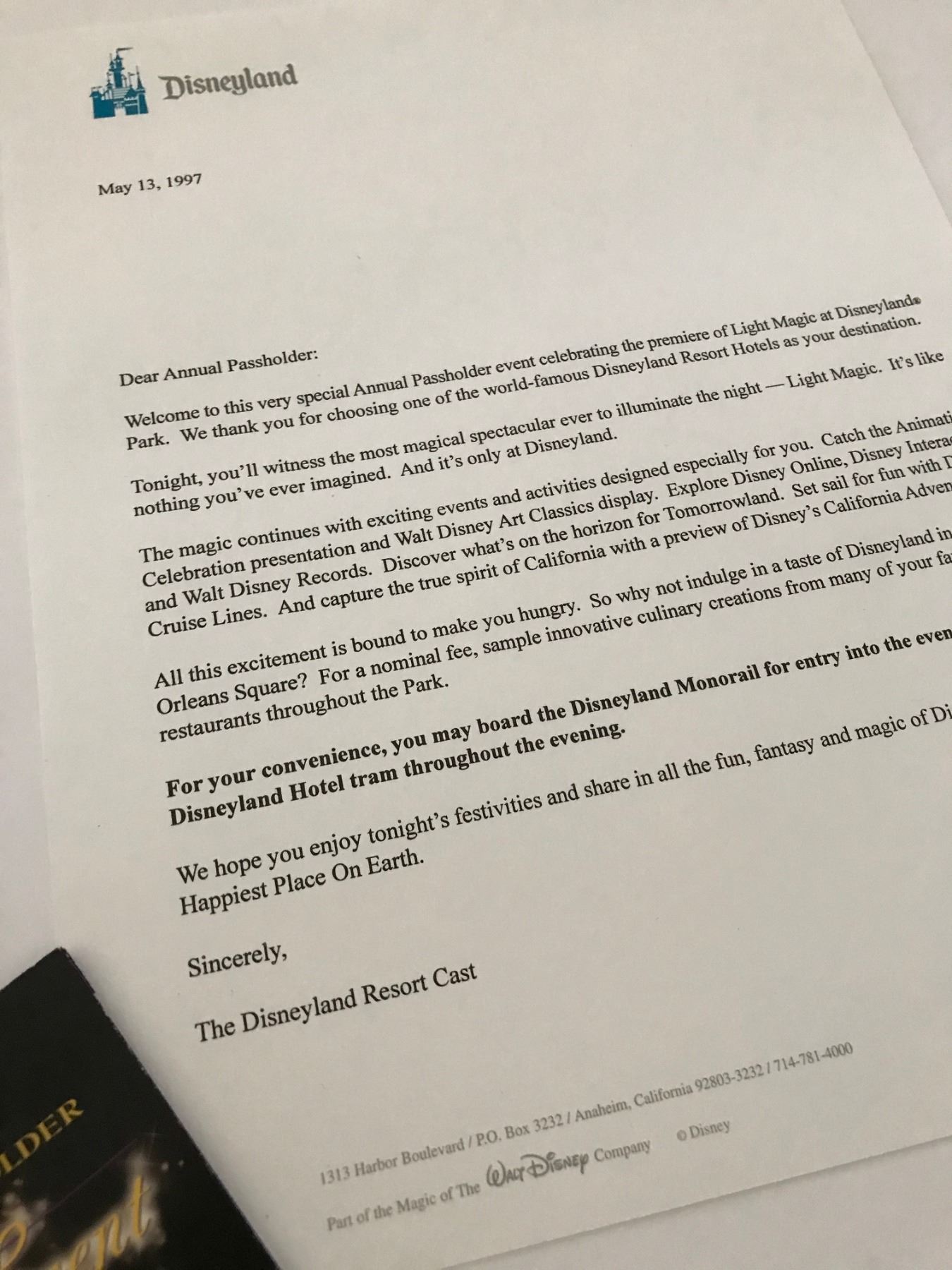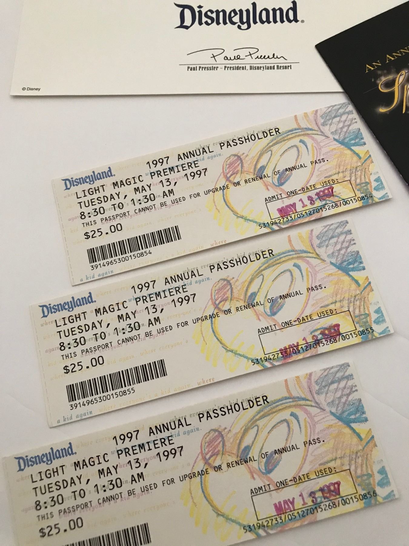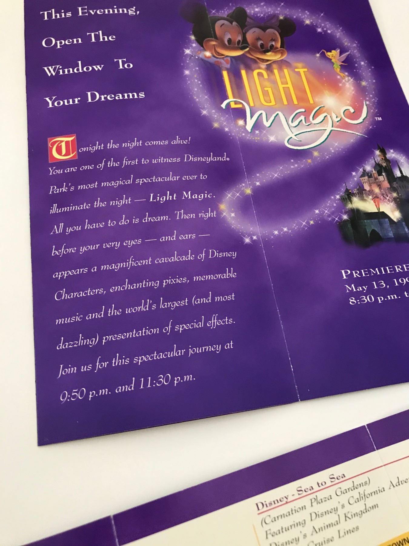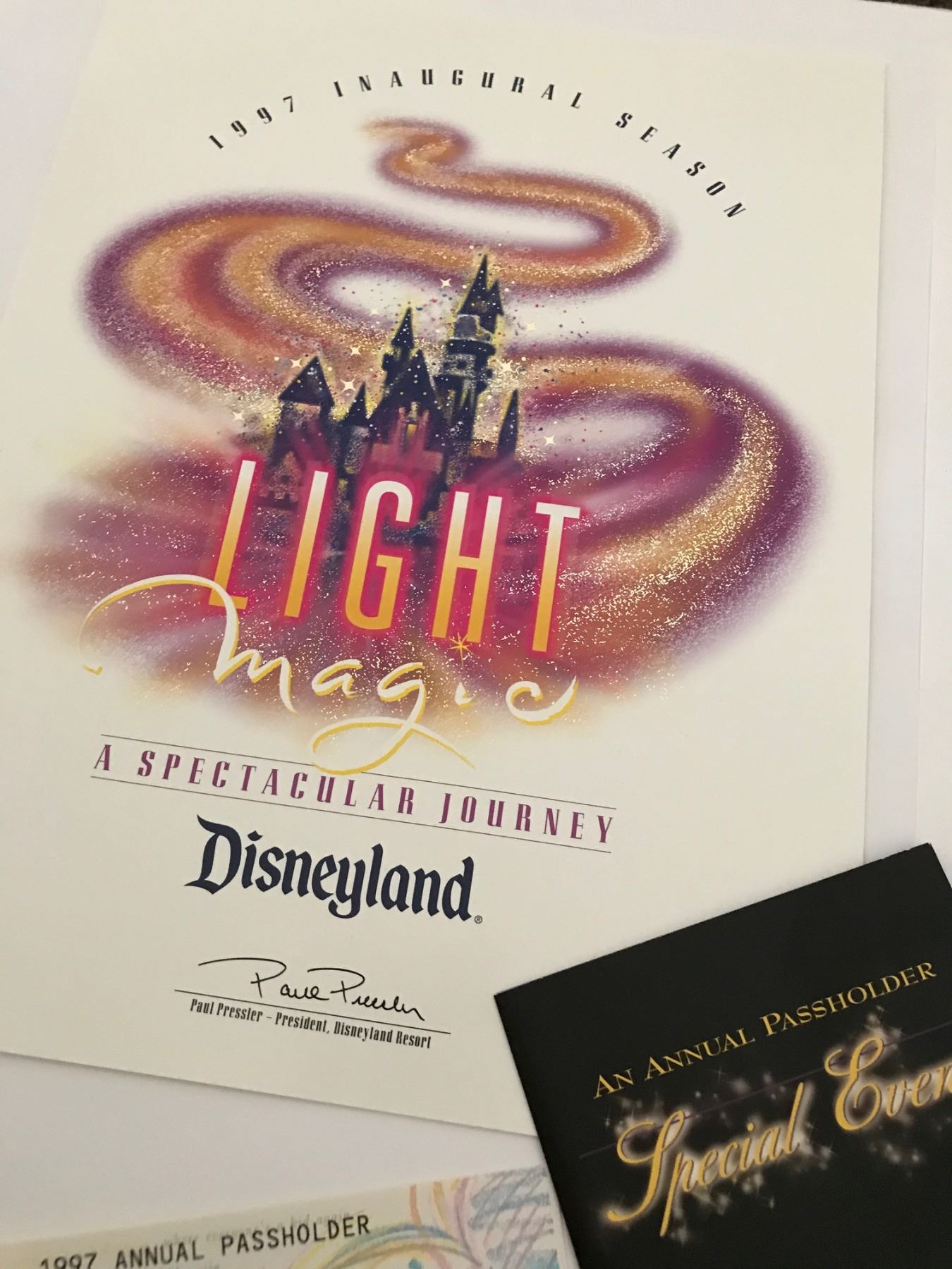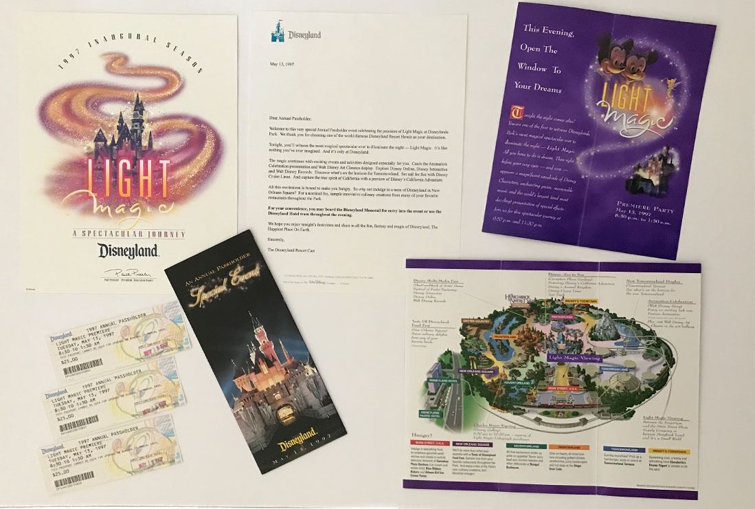 (Disneyland, c. 1997). A rare Disneyland Light Magic parade opening event kit. The Light Magic parade premiered in 1997 and was immediately met with mixed responses from park guests. It quickly earned the nickname "Light Tragic" and within four months it was shut down, never to return to operation (despite promises by Disney that it would in 2000). it continues as one of the most infamous attractions of Disneyland's past with a cult following. Presented here is a rare opening event kit for the original 1997 Light Magic parade of Disneyland. Included in the kit is a 1997 inaugural season brochure, annual passholder grand opening night letter, premiere tickets and multiple maps with Light Magic marketing and the inclusion of the parade on the park map. The items are in good condition with normal wear from age and handling. Item comes with a Grand Circle Tour Auctions COA.