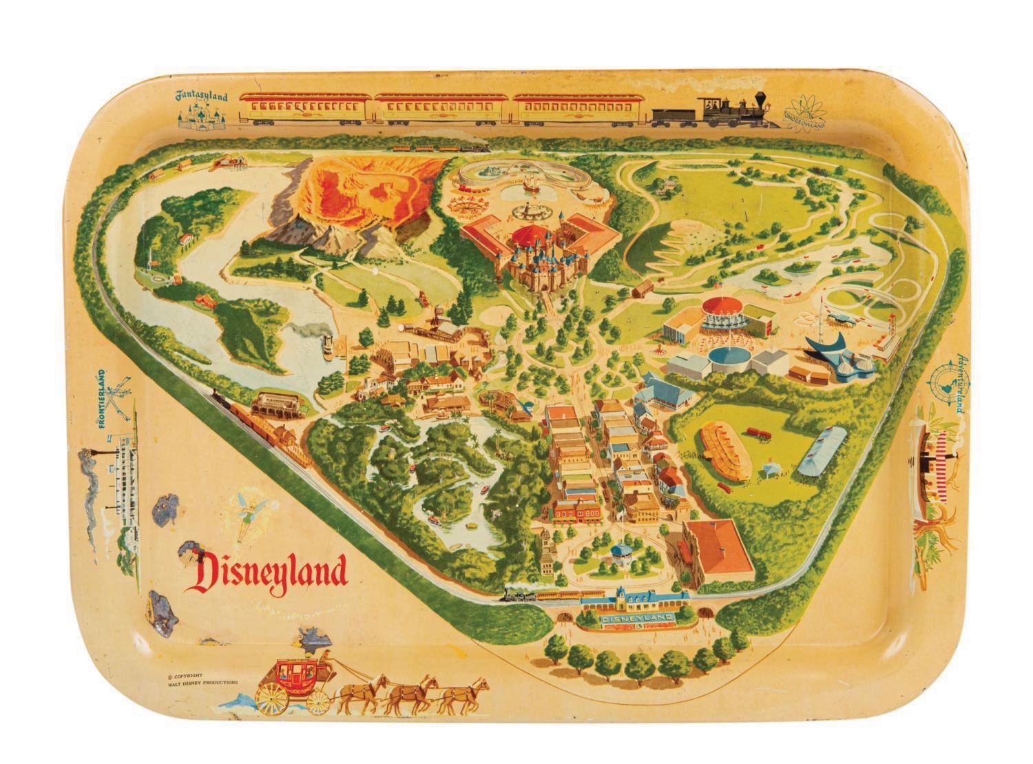 (Disneyland, 1955) An aluminum lithographic Disneyland tray. This tray features a color aerial view of the Park, depicting some of its inaugural lands and attractions alongside those still recognizable today. The piece offers a glimpse into some of the earliest licensed Disneyland merchandise. Measuring 12.5"x17.5", the tray bears heavy scratches in the bottom left corner and minor wear but otherwise is in good condition.