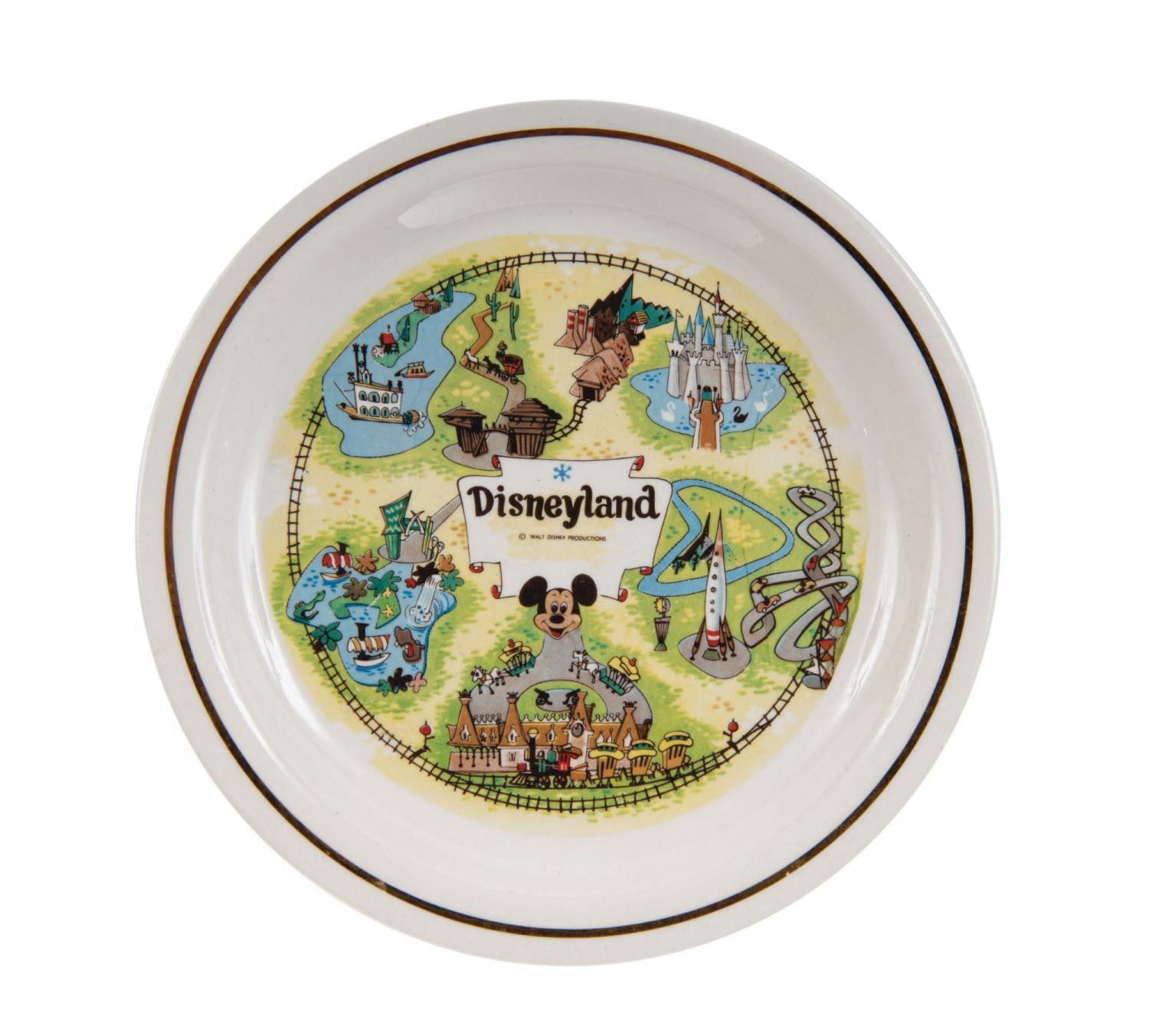 (Disneyland, 1956) An early ceramic souvenir plate depicting a vintage 1956 Disneyland map. The reverse features a legend in metallic gold: "Disneyland…whose realms provide the time machine for a journey back into history, a rocket trip into the future, a visit to a world of imagination and dreams, and an exploration of a jungle wonder world…truly the ‘Happiest Place on Earth.'" Measuring 7.5" in diameter, the souvenir is in very good condition with minor surface scuffs and a few pinpoint imperfections to the reverse.