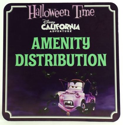 (Disneyland, c. 2000's). A park used prop sign for Halloween Time featuring Mater from the Disney Pixar file franchise "Cars." The sign is in good condition with normal wear from age and park use.
