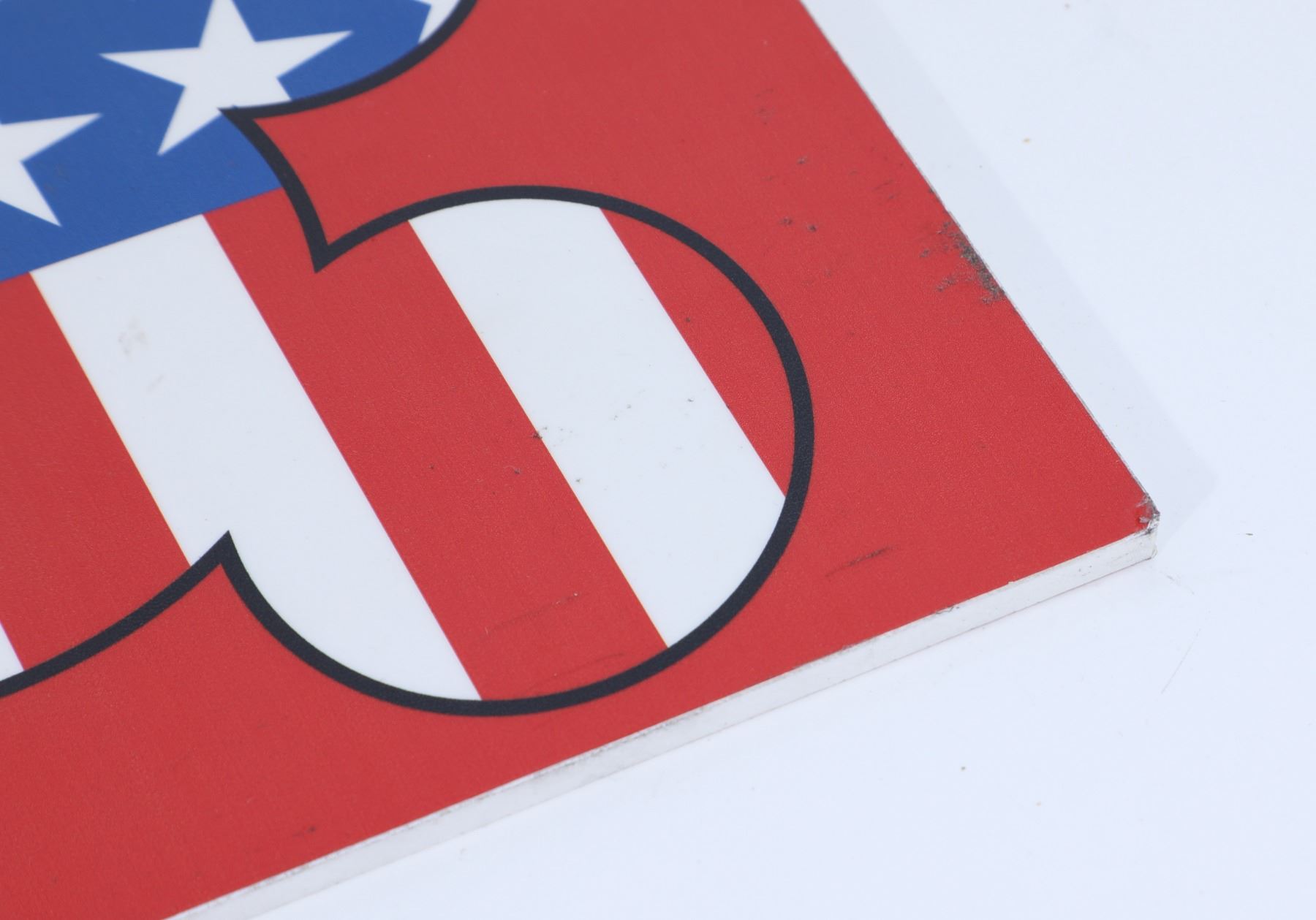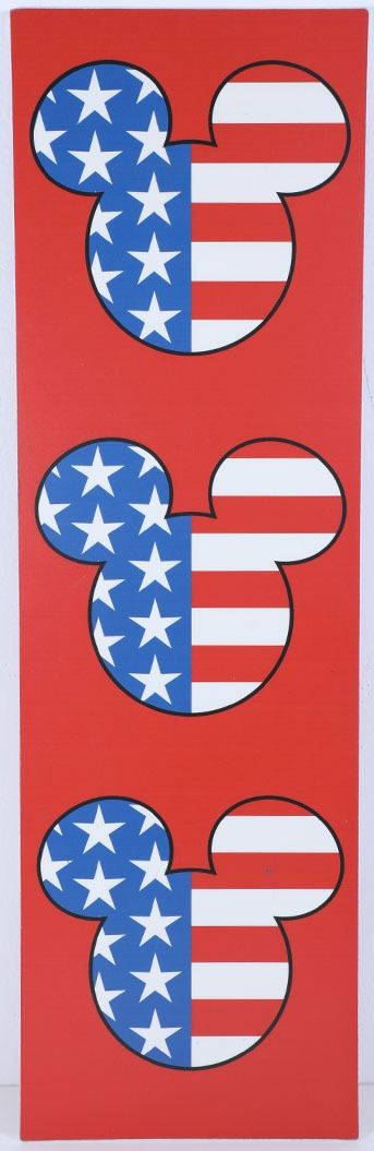 (Disneyland, c. 2010's). A Disneyland park used sign to celebrate the 4th of July, featuring three Mickey Mouse silhouette heads with backgrounds of the U.S.A. flag. The sign is in good condition with normal wear from age and park use. Measures 26" x 8". Item comes with a Grand Circle Tour Auctions COA.
