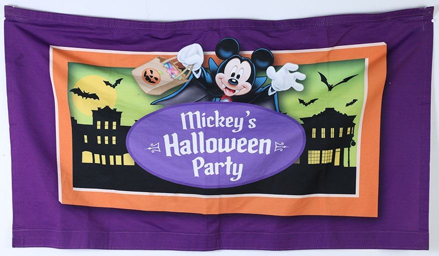 (Disneyland, c. 2000's). A park used prop banner for Mickey's Halloween Party. The banner is in good condition with normal wear from age and park use.
