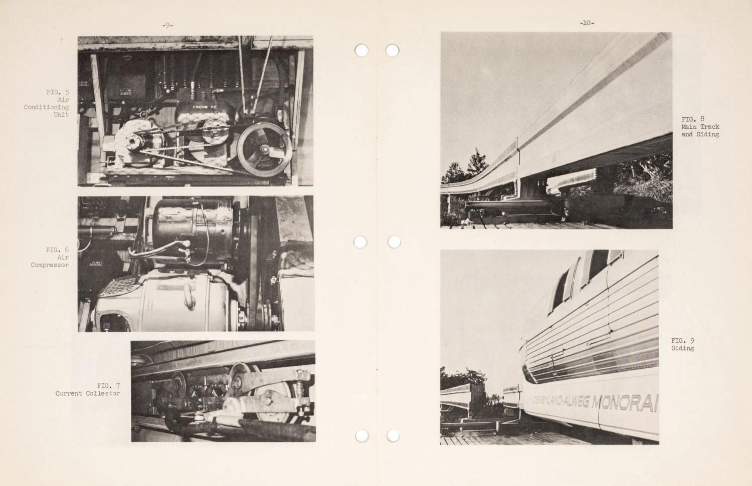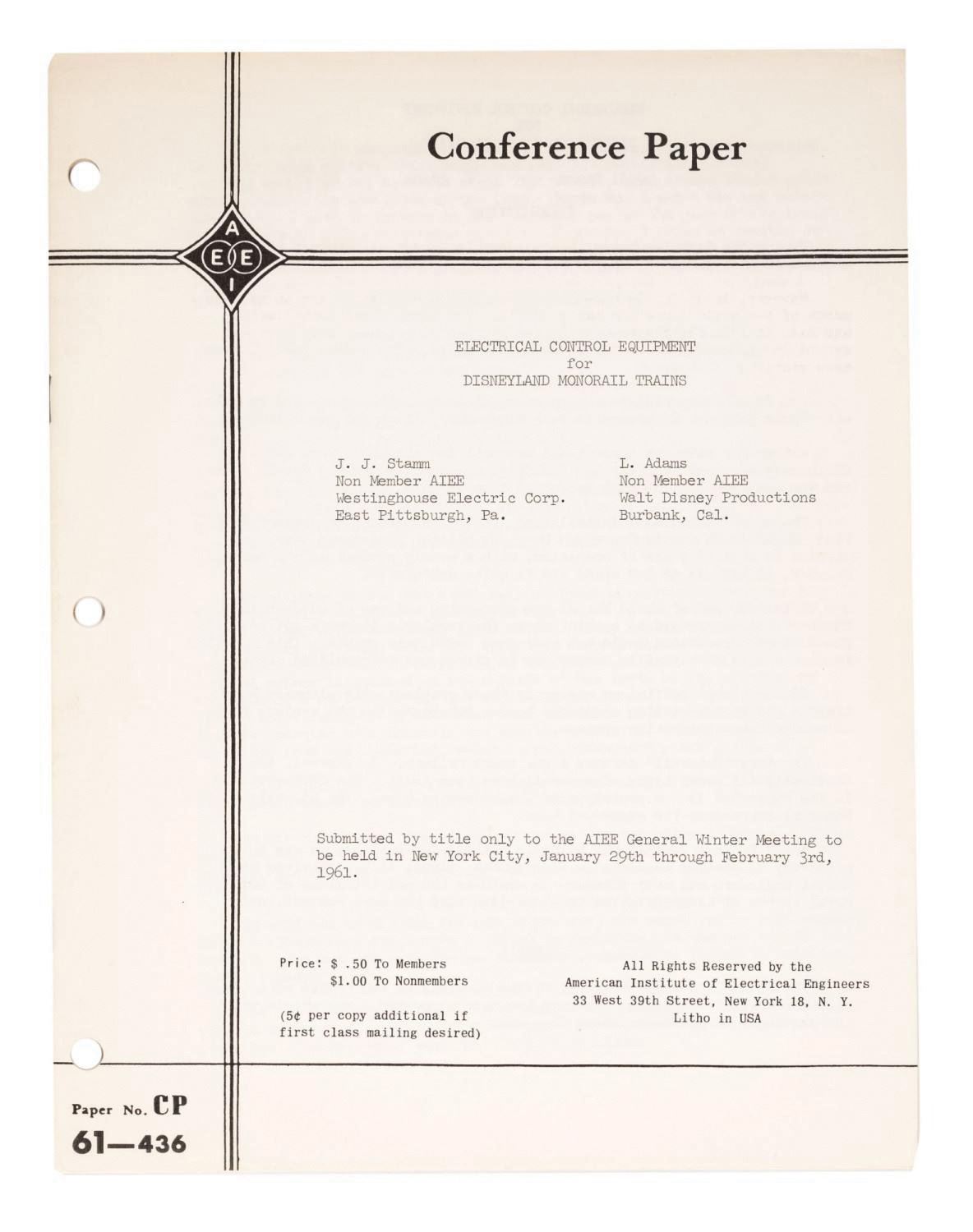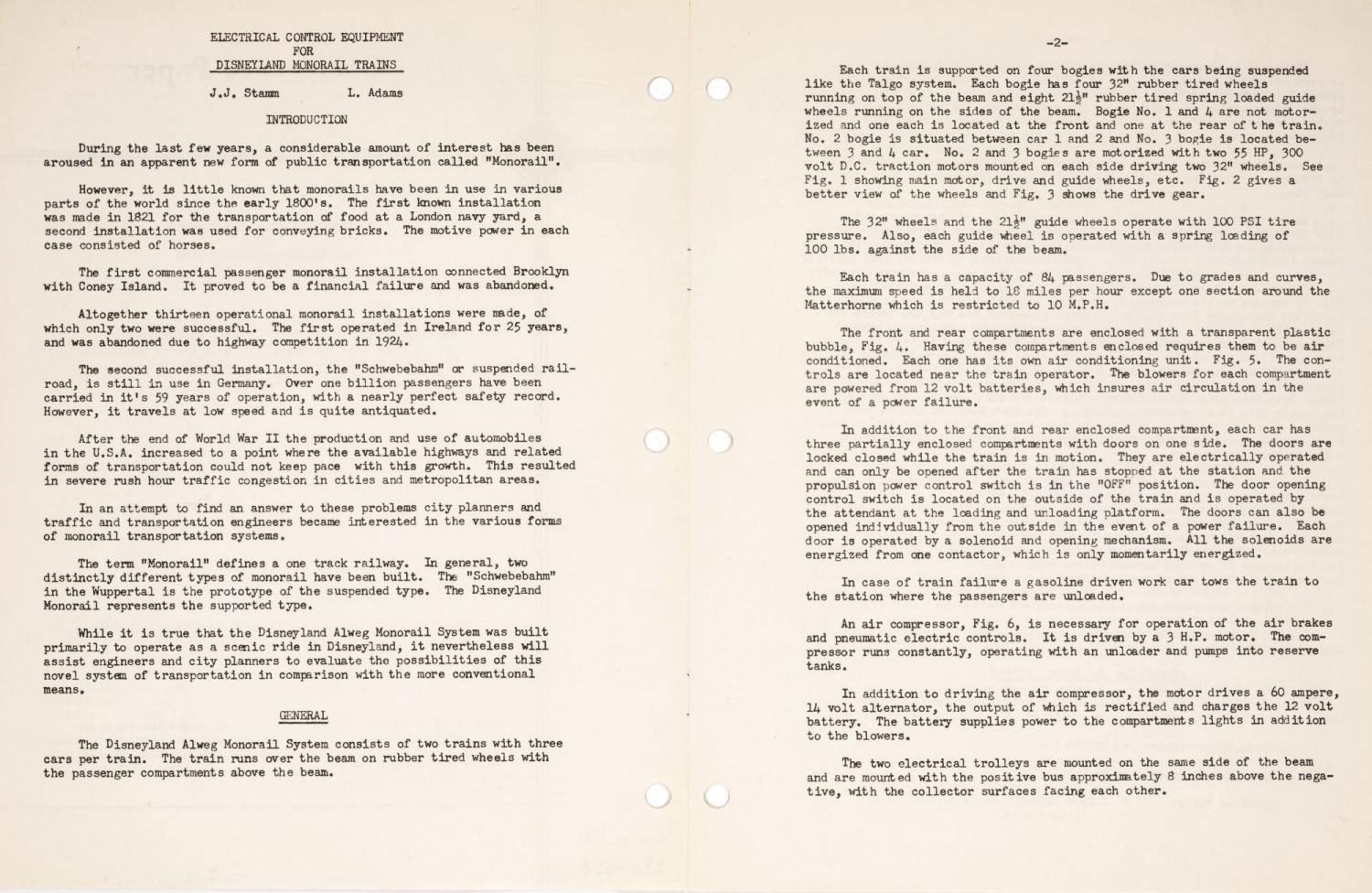 (Disneyland, 1961) A document listing information on the electrical control equipment for Disneyland's Monorail Trains. Prepared by Walt Disney Productions and Westinghouse Electric Corp, the document contains early technical data about the control operations and protective features, supported by rarely seen photograph figures of the undercarriage bogies, air conditioning unit, and Automatic Block Signal System. The document was prepared to present the requirements for practical application of monorail transportation outside Disneyland. Measuring about 10.75"x8.5" the 14-page, bound, hole-punched document is in very good condition, exhibiting slight wear to edges and corners.