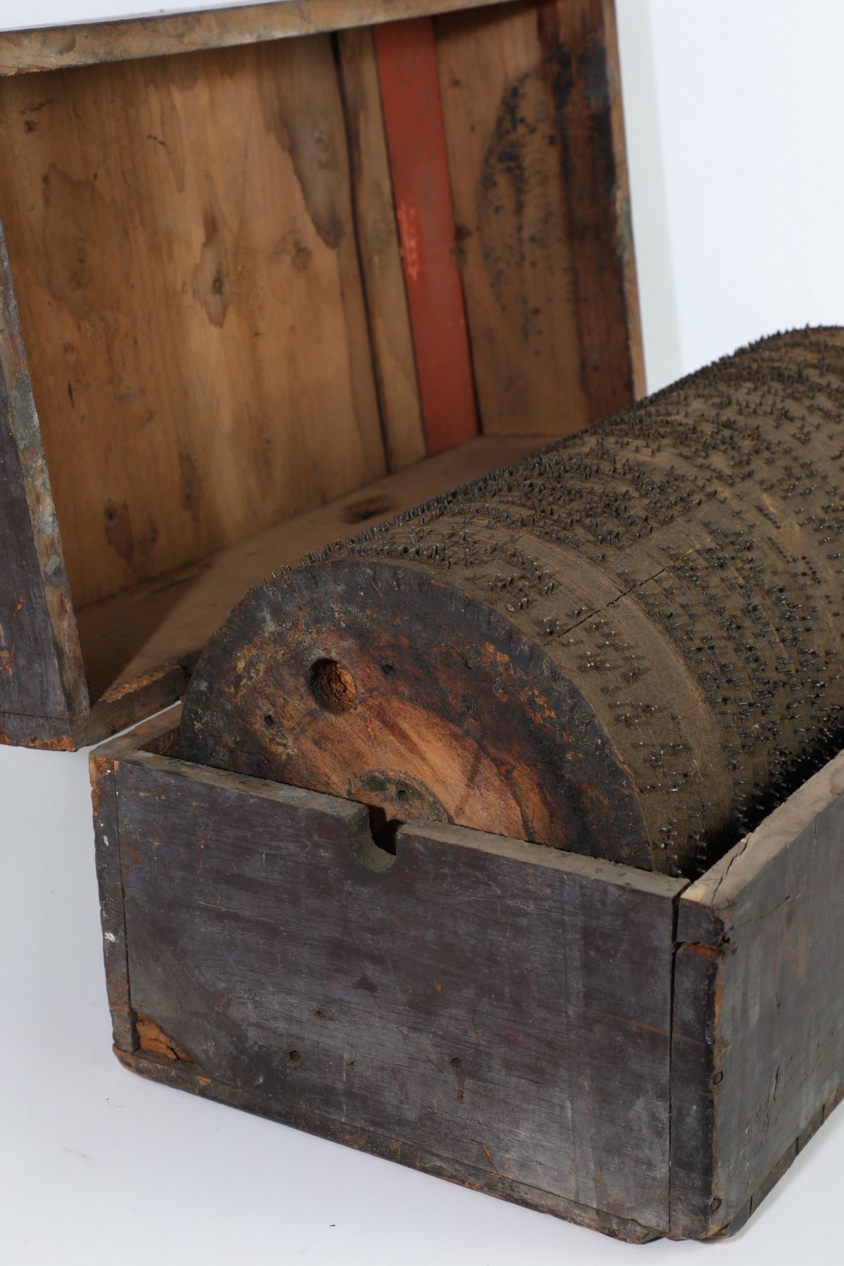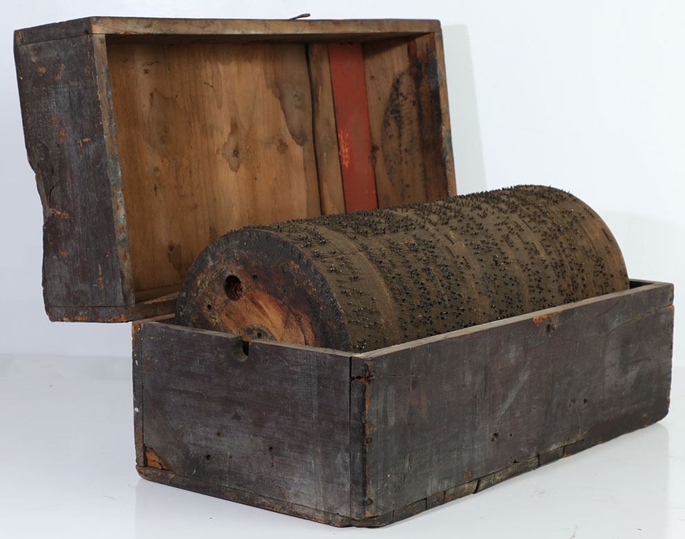 (Disneyland, c. 2000s). A Disneyland Pirates of the Caribbean attraction prop music roll. Music rolls are used in automatic piano players for guiding the mechanics and music production of the piano. The music roll is composed of wood with metal pins extending all the way around its cylindrical surface. The music roll is in fair condition with normal wear from age and use in the park. The music roll comes in its original carrying wooden box. The item measures approximately 21" x 11.5". Item comes with a Grand Circle Tour Auctions COA.