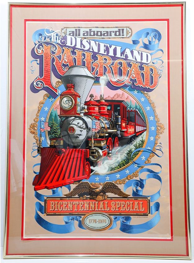 (Disneyland, c. 1976). A rare park used Disneyland Railroad 1976 silkscreen attraction poster, designed by artist Jim Michaelson and celebrating America's Bicentennial. Known to be one of the most complicated silkscreen posters ever made, requiring sixty separate screens and several months to create the artwork. The poster measures approximately 53" x 38" and was originally displayed in the park. The poster is in good condition with normal wear from age and handling, including some minor edge wear. Item comes with a Grand Circle Tour Auctions COA.