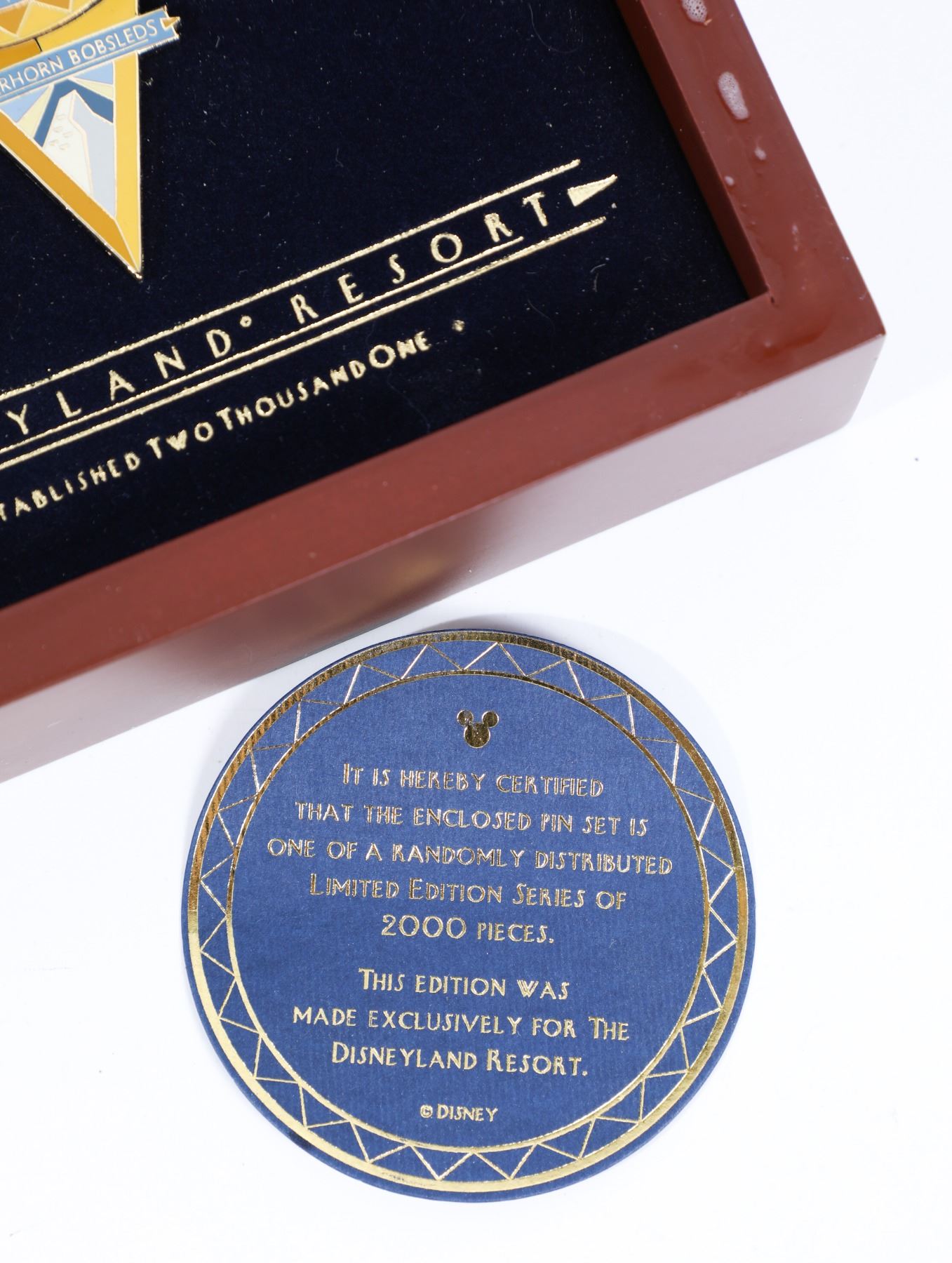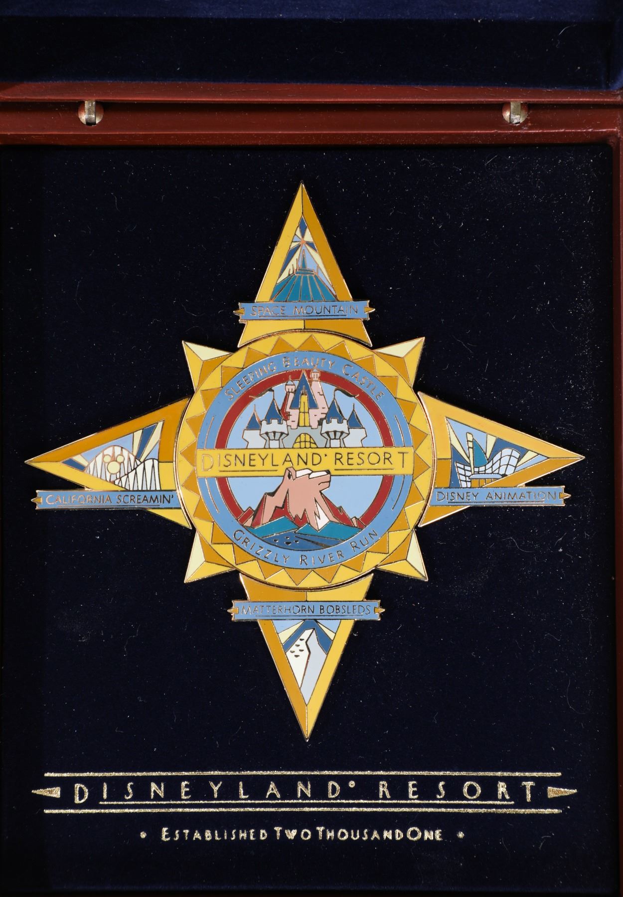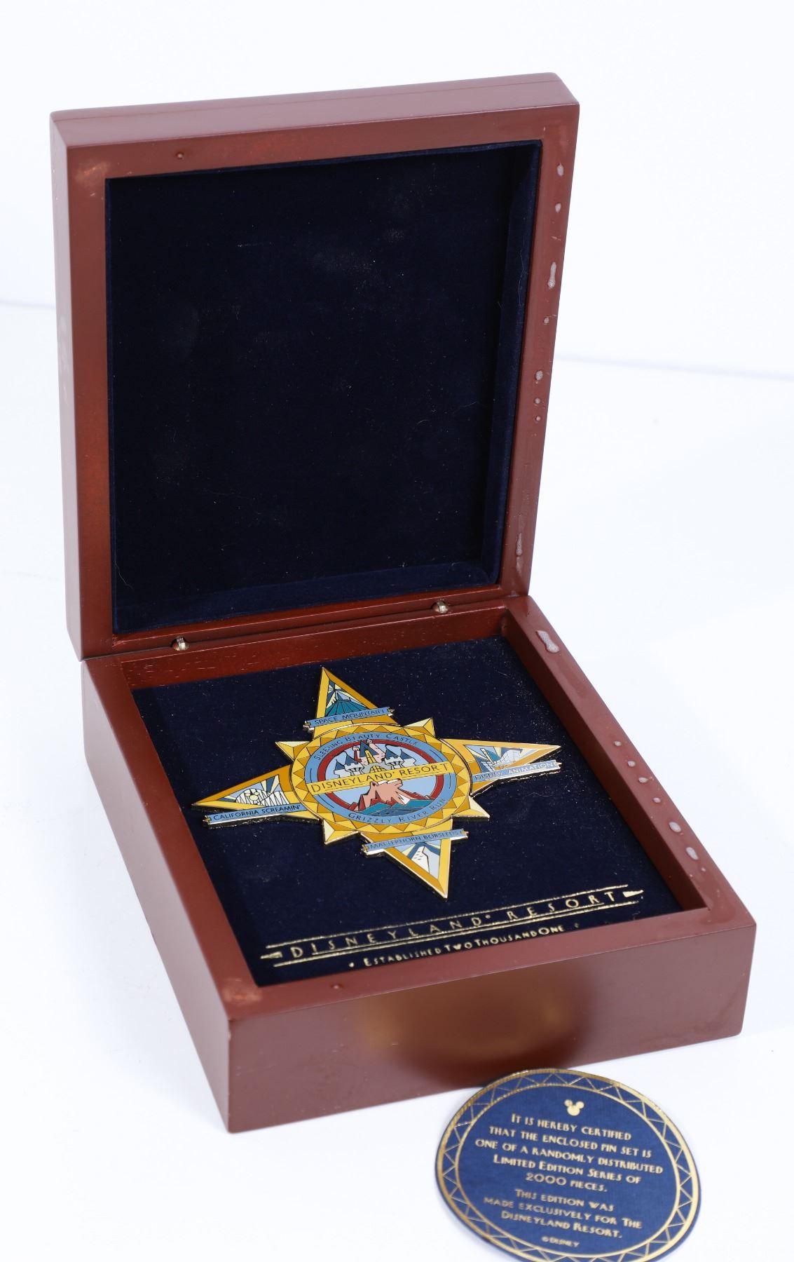 (Disneyland Resort, c. 2001). A Disneyland Resort limited edition premiere wooden box pin, celebrating both Disneyland Park and Disney California Adventure Park. The pin set is composed of five pins that connect together to display a large star. The pin set was released just prior to the opening of Disney California Adventure in a limited edition of 2000. The pin set is in good condition with normal wear from age and minimal handling, being housed inside its original display box which measures approximately 6.5" x 5.5". Item comes with a Grand Circle Tour Auctions COA.