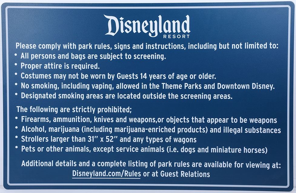 (Disneyland, c. 2000's). A park used prop sign for the Disneyland Resort for rules of the park. The sign is in good condition with normal wear from age and park use and because it has important safety information, it is made of metal. The sign measures approximately 31" x 20". Item comes with a Grand Circle Tour Auctions COA.