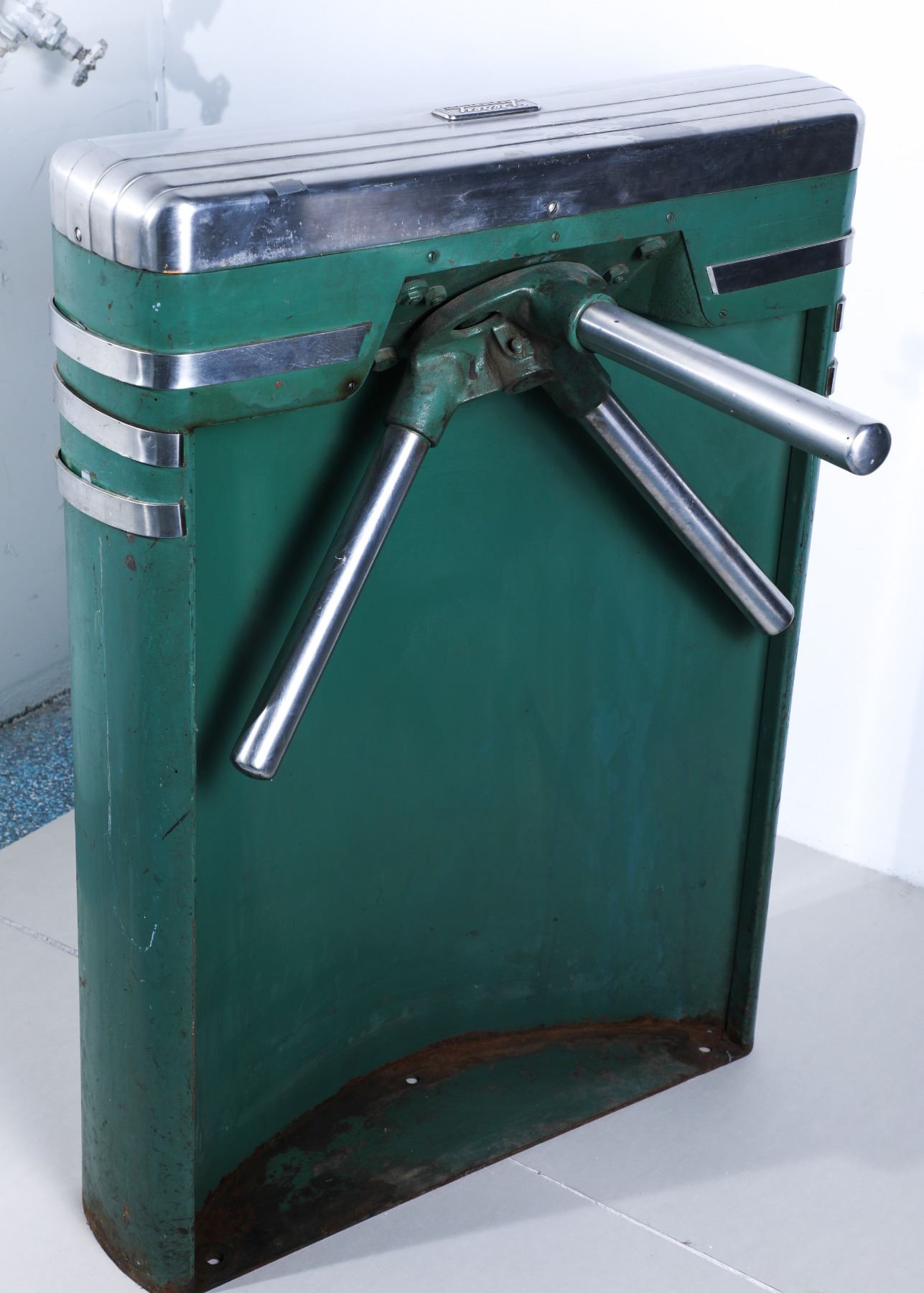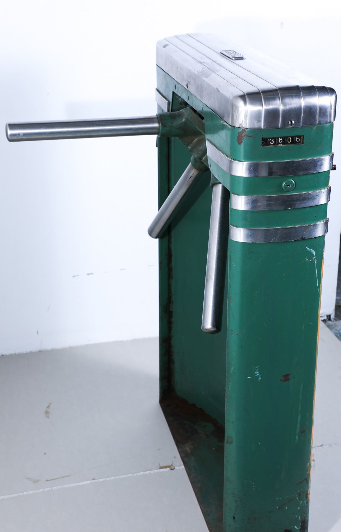 (Disneyland, c. 1980's-2000's). A rare park used turnstile from the Disneyland Resort. Turnstiles like these could be used at the park entrances and exits, as well as, while in the queue of popular attractions. The turnstile is in good condition with normal wear from age and park use. Measures approximately 38" tall x 26" x 20". Item comes with a Grand Circle Tour Auctions COA.