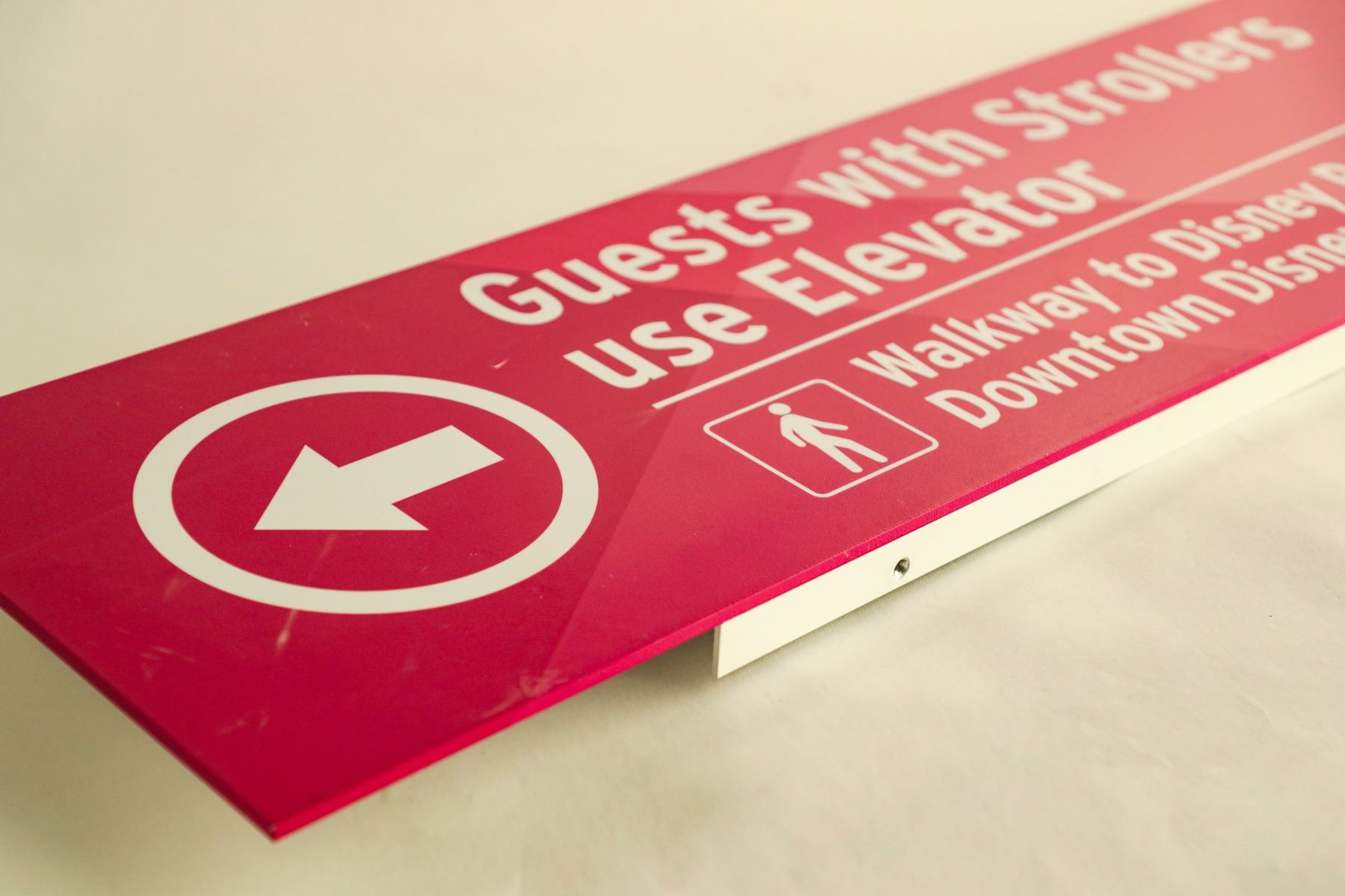 (Disneyland, c. 2015). Disneyland Resort park used sign for directing guests to either Disneyland, Disney California Adventure or Downtown Disney. The sign also notes "Guests with Strollers use Elevators." The sign is constructed in metal with vinyl graphics. It's well built and heavy. Normal wear from time in service.