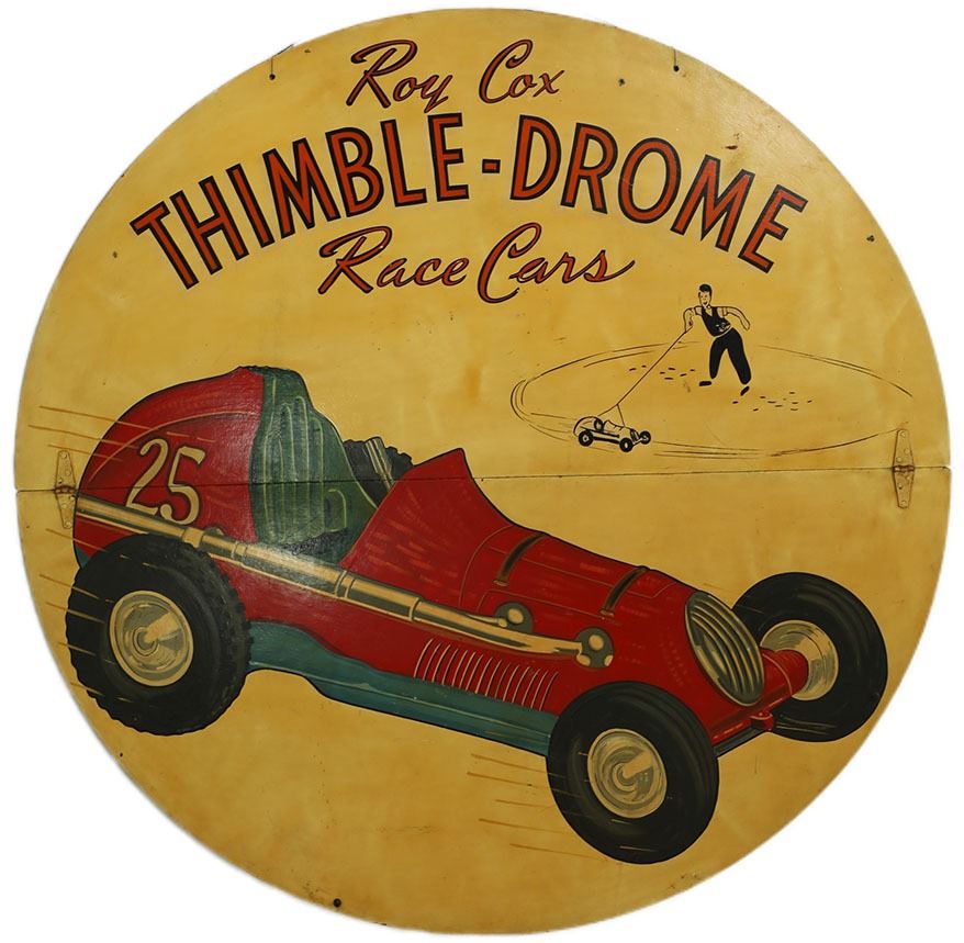 (Roy Cox & Disneyland, c. 1961) A Rare Roy Cox Thimble Drome Sign that was created in connection with Disneyland's "Thimble Drome Flight Circle", circa 1961. The sign is made of masonite board and is hand painted. The sign can fold in half. All original hardware and brackets. During that era there was a Roy Cox warehouse in Santa Ana. The Cox company was given a contract with Disneyland to sell and operate their motorized planes, boats, and tether cars. During the time that Cox sponsored the The Flight Circle, which became known as Thimble Drome Flight Circle, Cox was allowed to advertise and sell their products at Disneyland, this section was recognized as Hobbyland. The sign measures approximately 48" in diameter.