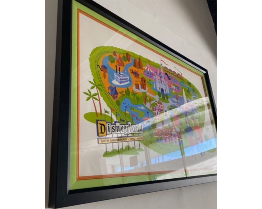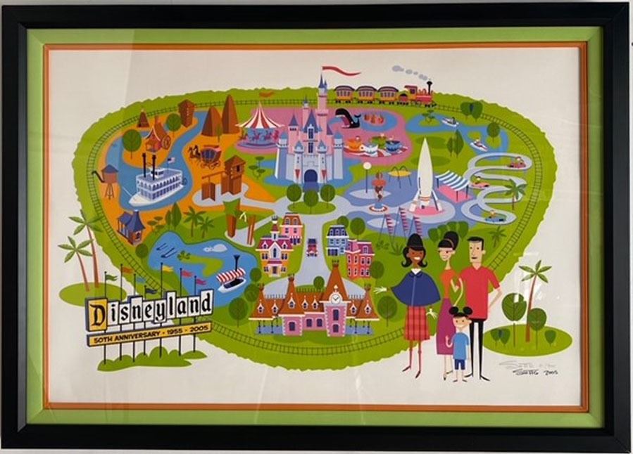 (Disneyland, c. 2005). Disneyland 50th Anniversary Limited Edition 51 of 300 serigraph created by artist Josh Agle 'SHAG'. At the time in 2005, SHAG remarked "The Disneyland Map is probably the most complicated and detailed painting I've ever done. It's really like a combination of 20 or 25 little paintings." This rare and highly sought SHAG map measures approximately 52" x 38" and comes in a Disney custom frame. The lithograph has been signed twice by SHAG, once for its initial run and then again during a park 50th anniversary celebration, making this lithograph very rare. The lithograph and frame are in good condition with normal wear from age and minimal handling. Item comes with a Grand Circle Tour Auctions COA.