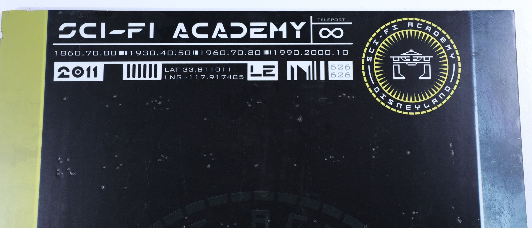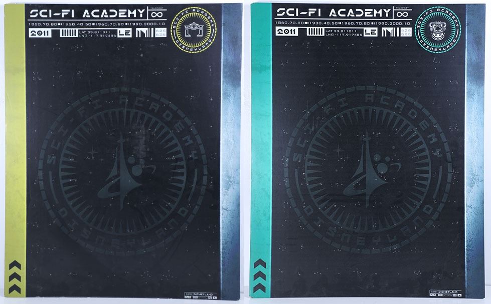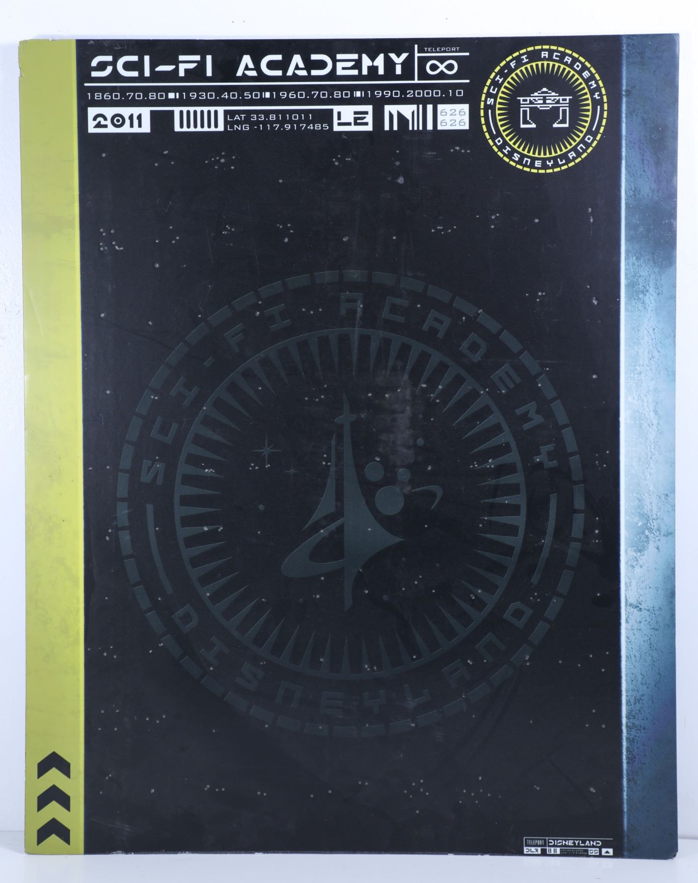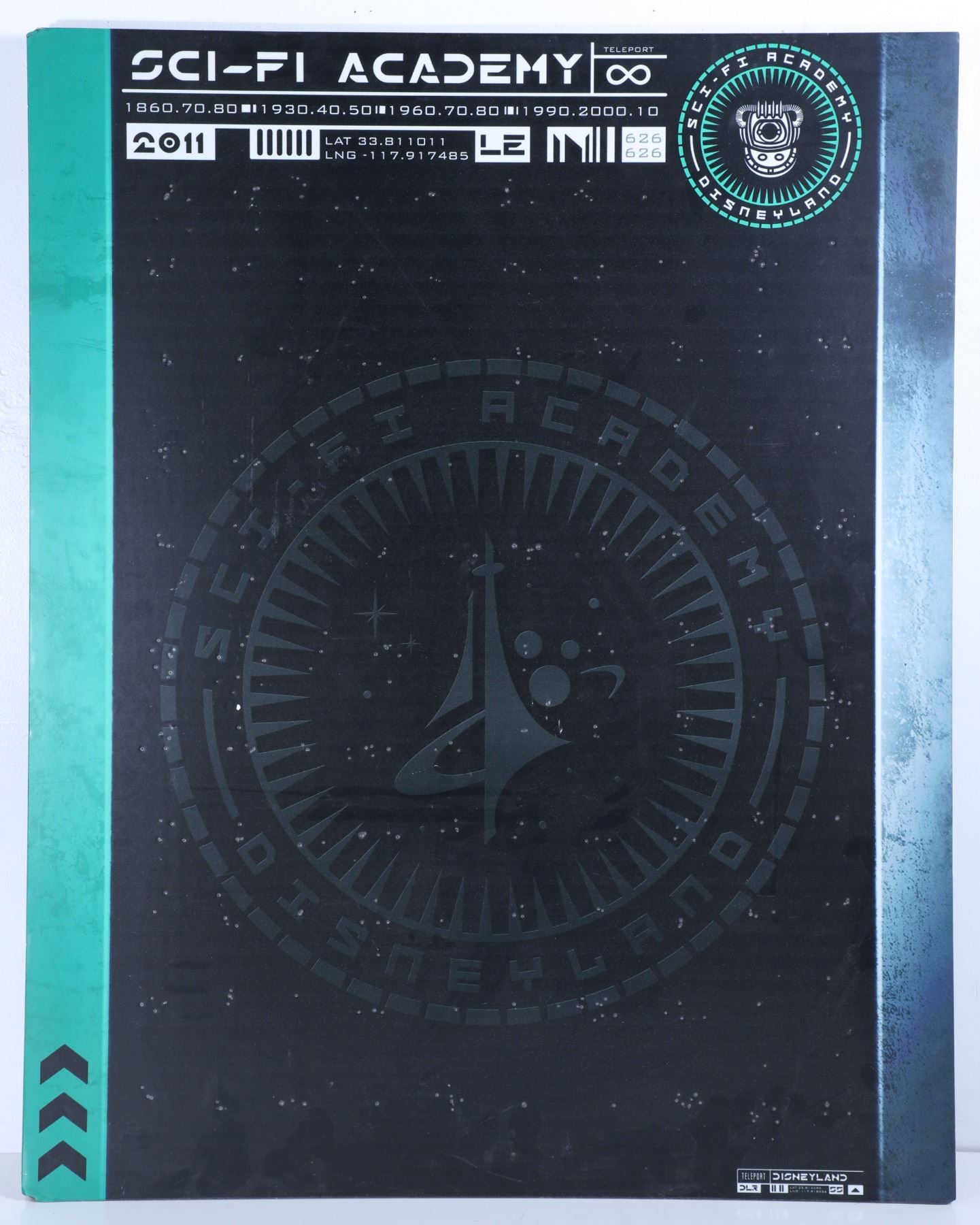 (Disneyland, c. 2011). Disneyland park used poster displays for the Tomorrowland Sci-Fi Academy. The posters are in good condition with normal wear from age and park use, including scuff marks and fading of the posters. Both posters are printed on foam core. The posters each measure about 34.75" x 27.75". Item comes with a Grand Circle Tour Auctions COA.