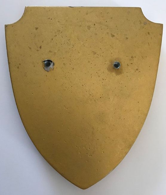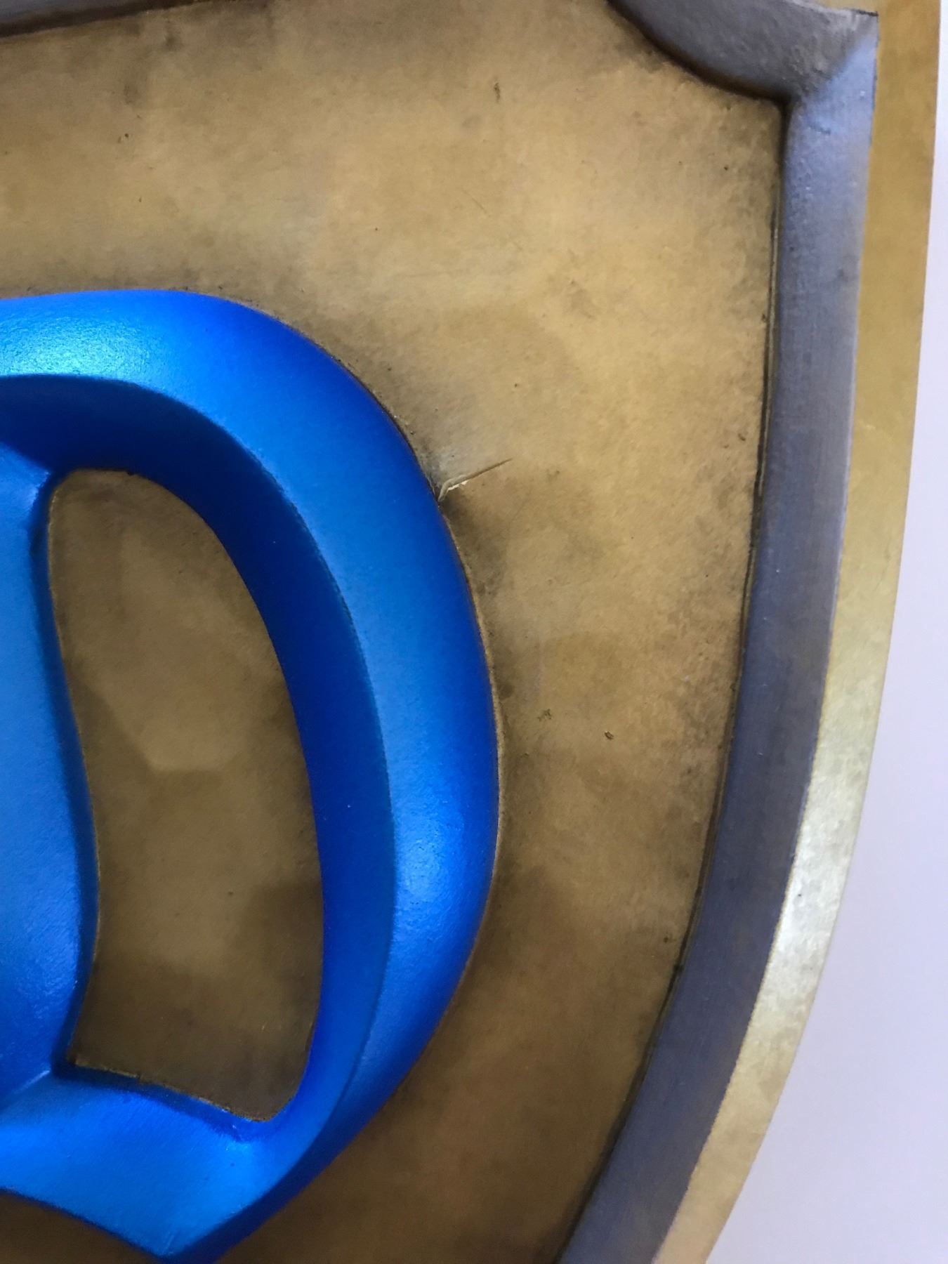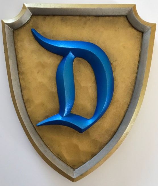 (Disneyland, c. 2015). A very rare and spectacular Disneyland Sleeping Beauty Castle shield featuring the classic Disneyland "D" in its 60th anniversary style. This shield was used on the Castle during the 60th anniversary celebration of Disneyland and subsequently removed afterwards. The shield is in good condition with normal wear from age and park use, including two holes in the back used for anchoring the shield in place when it was in use. It is made of resin and delicately painted, and measures approximately 8" x 8" x 3". Disneyland Sleeping Beauty Castle shields like this are rare to find. Item comes with a Grand Circle Tour Auctions COA.