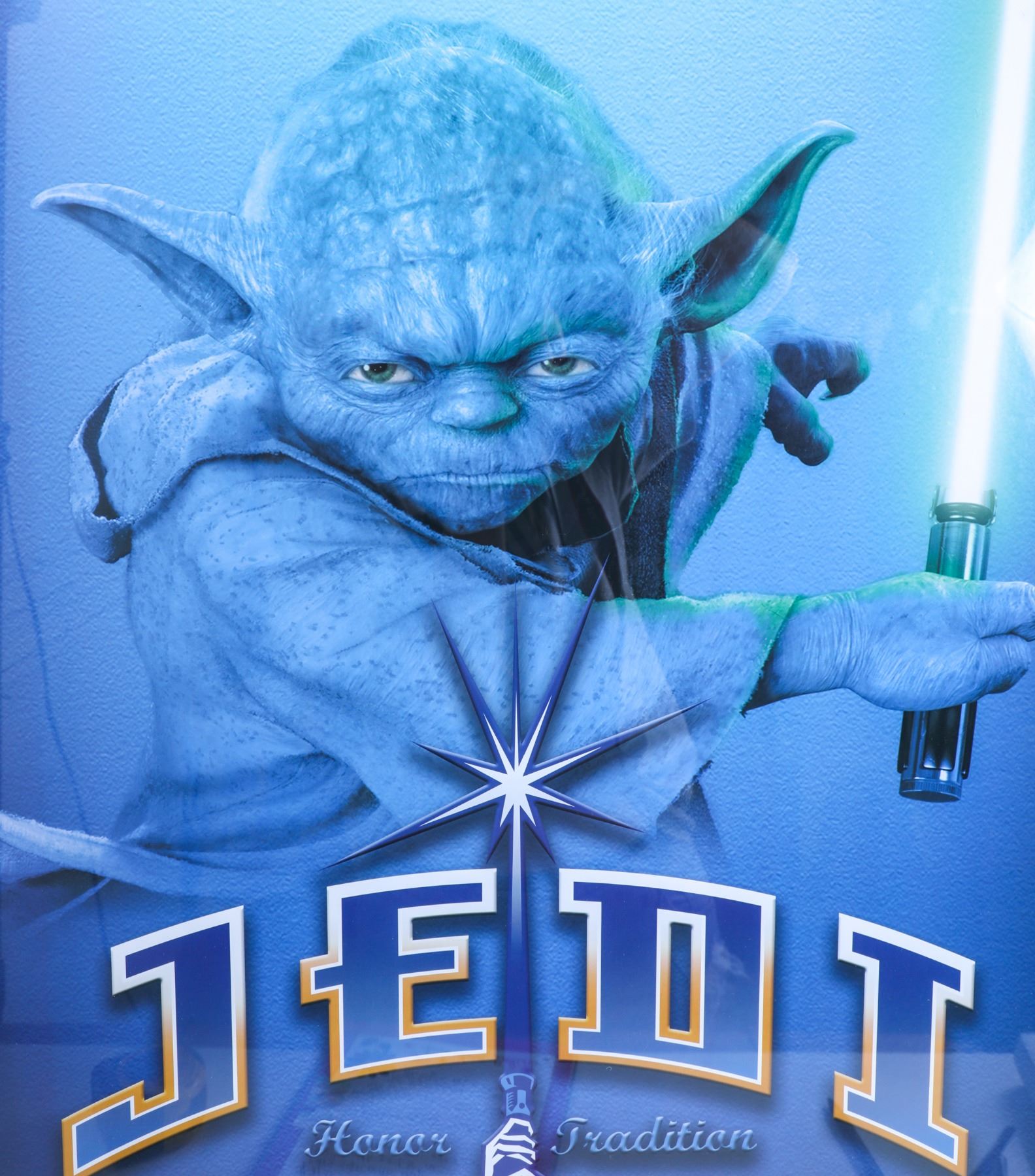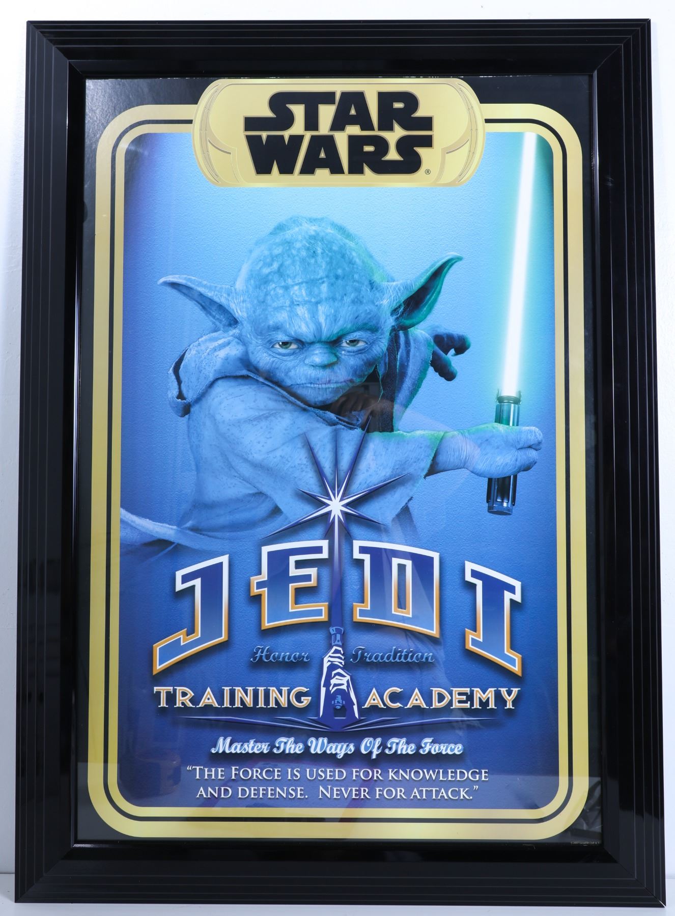 (Disneyland, c. 2010's). A rare Disneyland Star Wars Jedi Training Academy poster. The poster features the classic Star Wars character Yoda. The poster is in good condition with normal wear from age and handling. The poster measures approximately 39" x 28.5" and is framed. Item comes with a Grand Circle Tour Auctions COA.