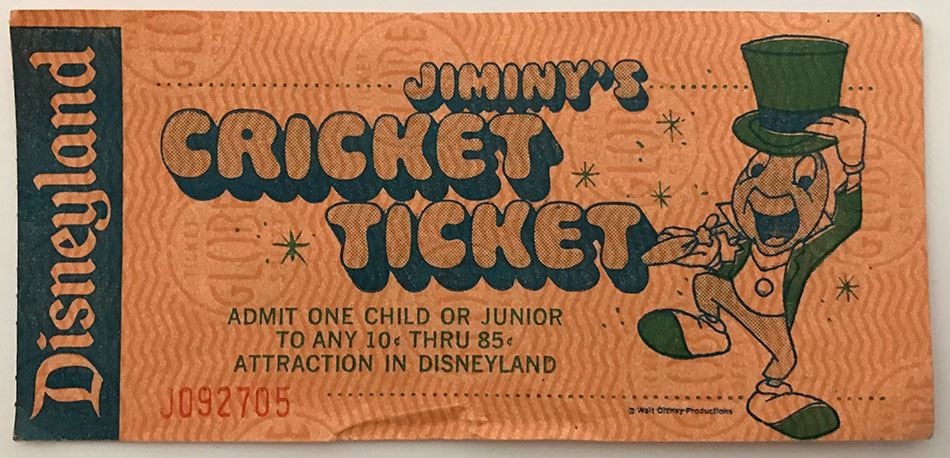 (Disneyland, c. 1955-56). A first series ticket of the Santa Fe & Disneyland Railroad. When Disneyland opened on July 17, 1955, the Santa Fe & Disneyland R.R. had two types of tickets available for two separate tracks. One was for a "One First Class Passage" that took the New Circle Route and the other was a freight passage ticket. The former ticket is offered here and is in good condition with normal wear from age and handling. Item comes with a Grand Circle Tour Auctions COA.