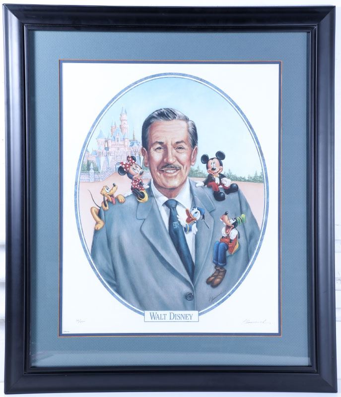 (Disneyland, Disney Gallery, c. 2001). A rare Disney lithograph "Walt Disney" signed by artist Peter Emmerich and in a limited edition size of 2500 and made available only to cast members. The lithograph was released on December 5, 2001 to celebrate the 100th anniversary of Walt Disney's birth. shows Walt Disney standing in front of Sleeping Beauty Castle with Mickey Mouse, Minnie Mouse, Goofy, Donald Duck and Pluto sitting on his shoulders or in his coat. The item measures approximately 32" x 27" and is in good condition with normal wear from age and minimal handling. Item comes with a Grand Circle Tour Auctions COA.