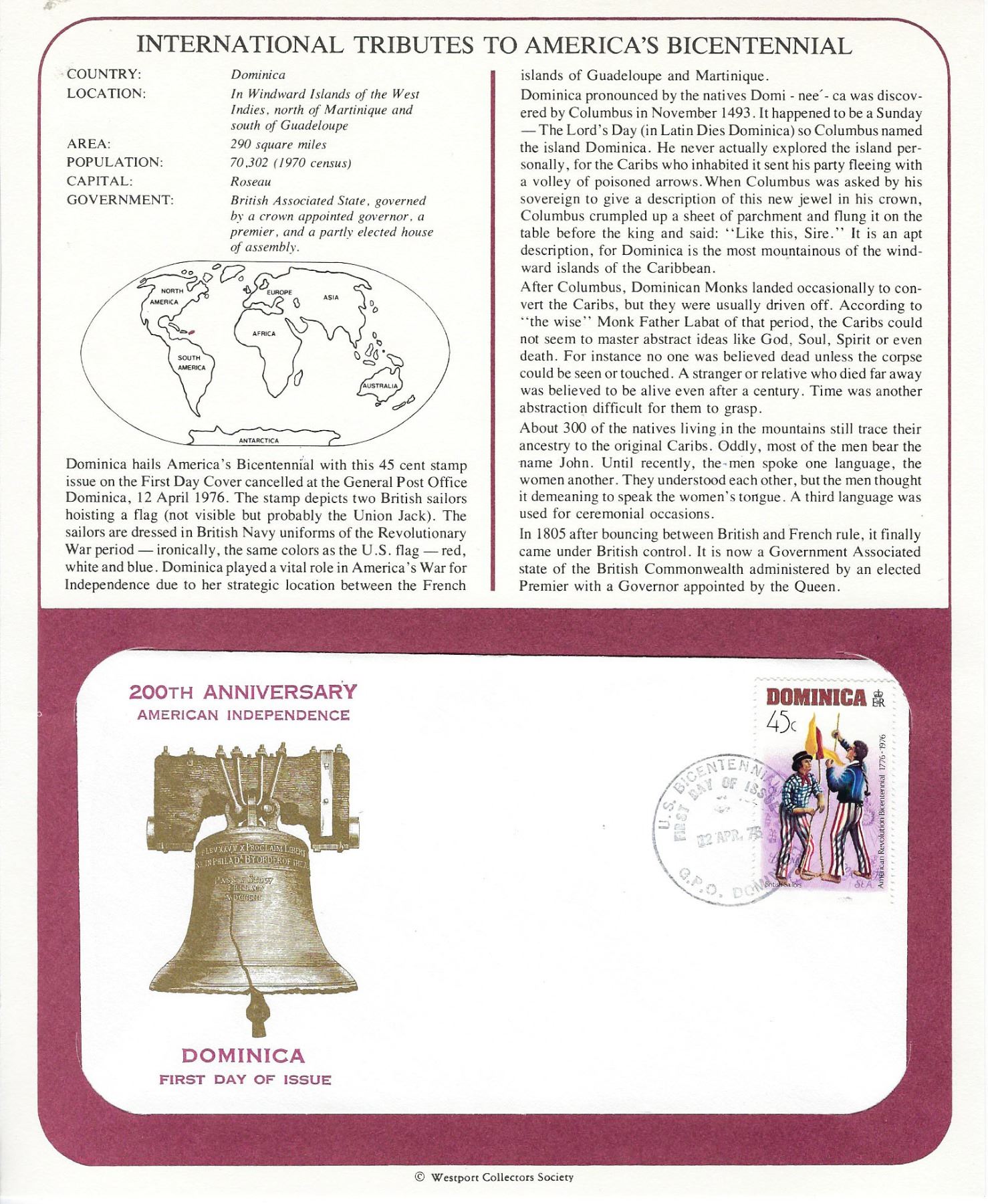 Dominica FDC - 200th Anniversary American Idependence - US Bicentennial G.P.O. Dominica - 02 Apr. 76