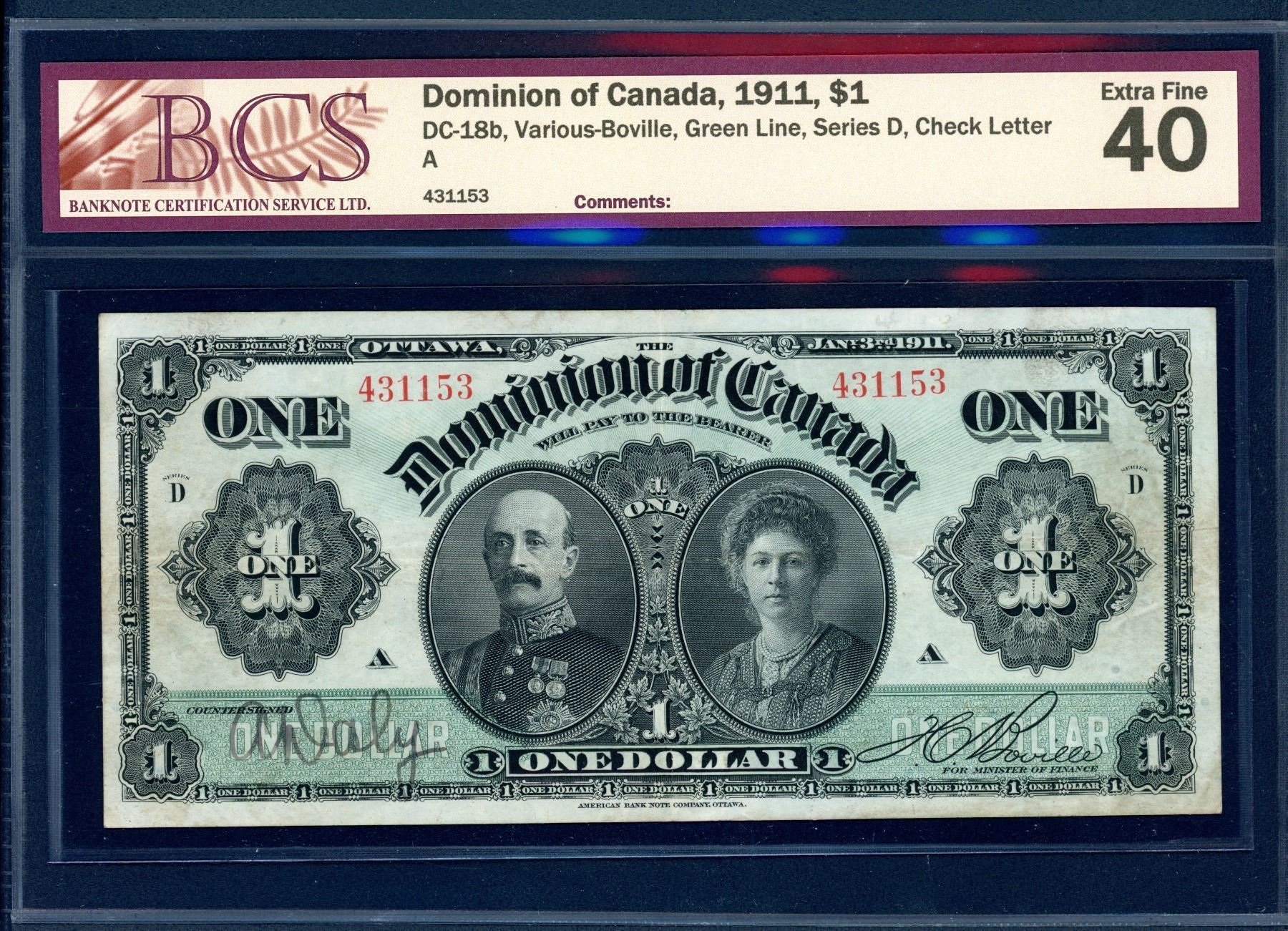 DC-18b, Boville Right, Green Line, BCS EF-40. S/N: 431153, and a nice-looking note
