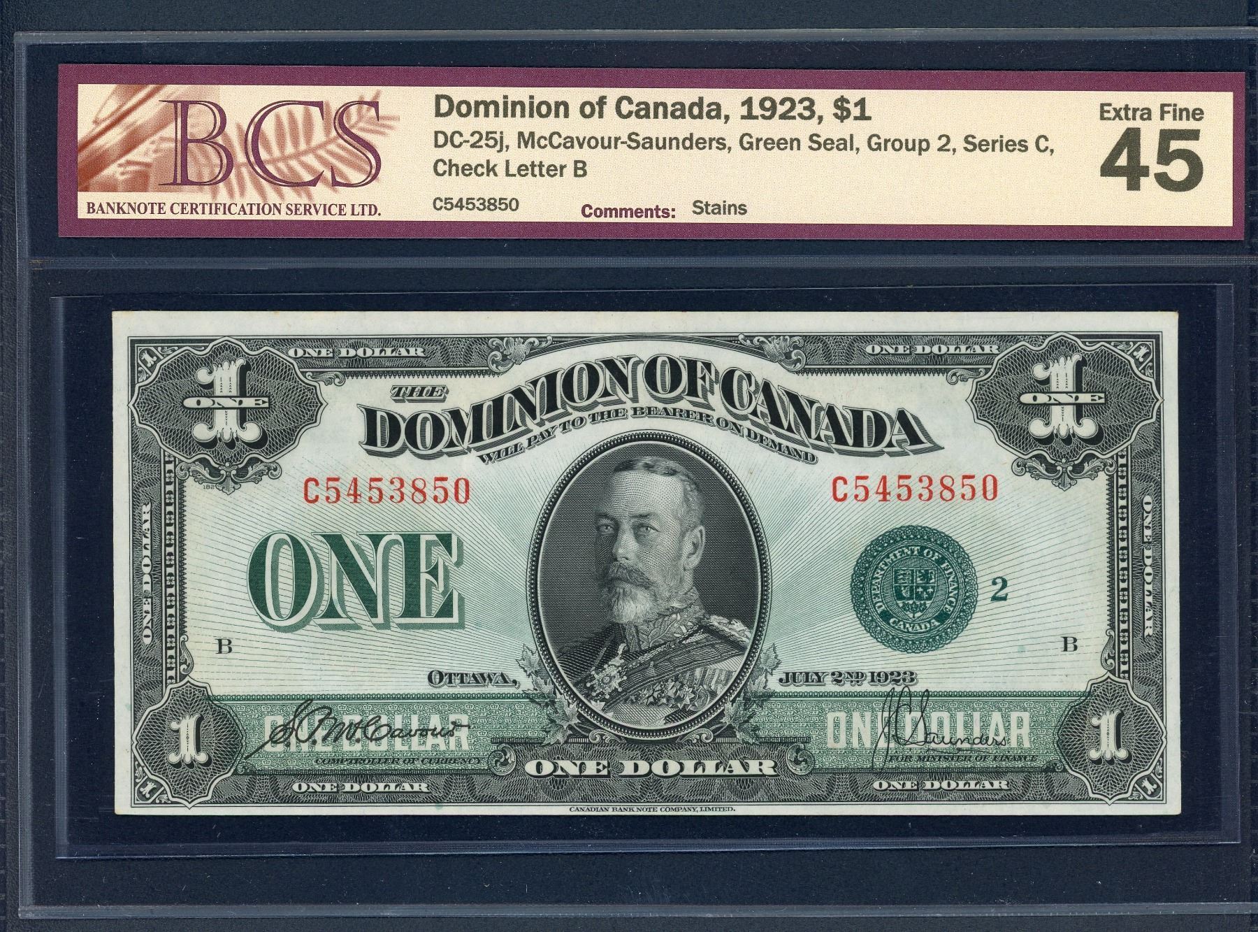 DC-25j, McCavour-Saunders, Green Seal, BCS EF-45, Stains. S/N: 5453850, a fresh and attractive note with very minor vertical red marks at back-center, possibly residue from an early rubber band