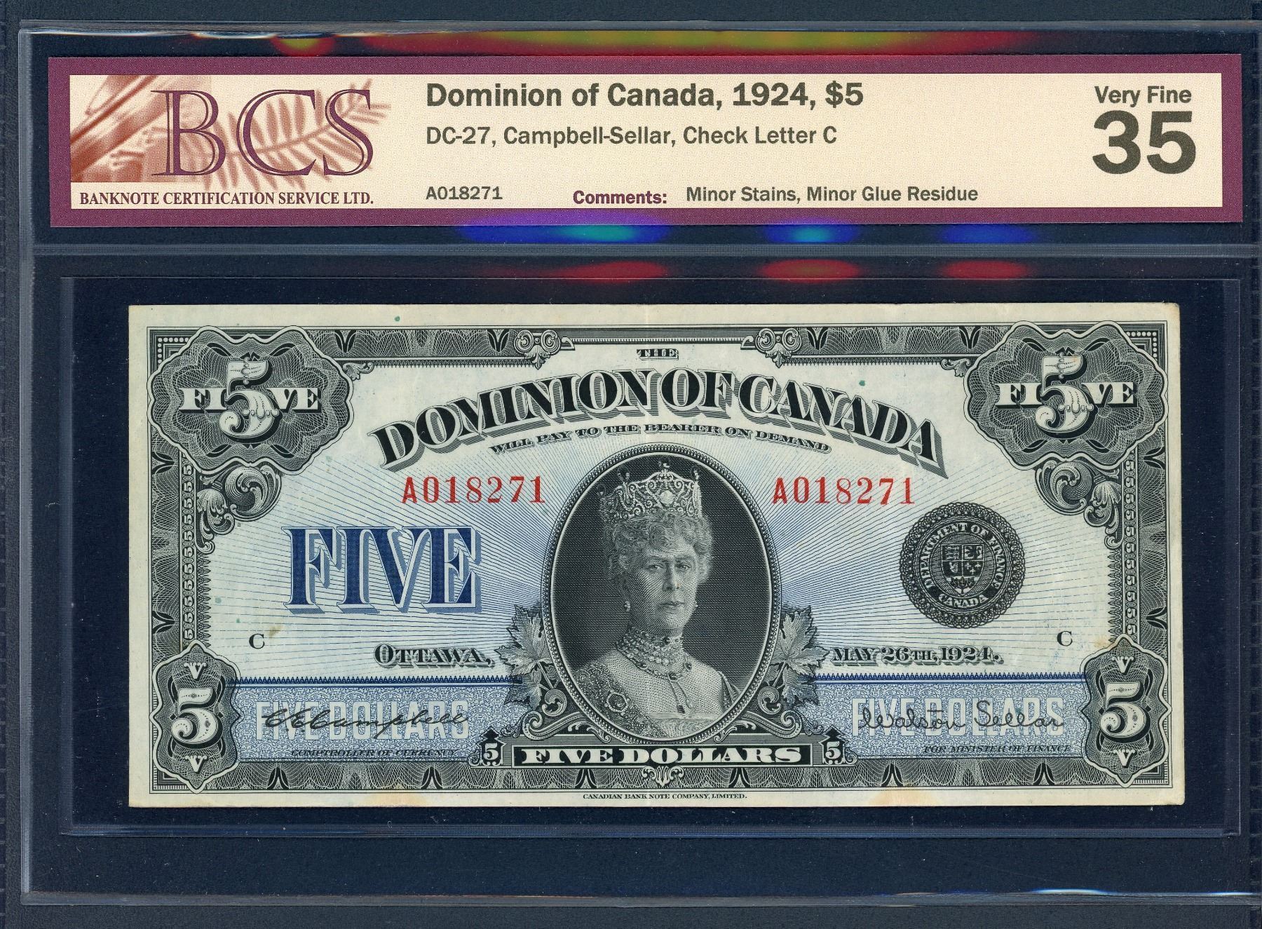 DC-27, Campbell-Sellar, BCS VF-35, Minor Stains, Minor Glue Residue. S/N: A018271. S solid and attractive example of this classic rarity, with good color