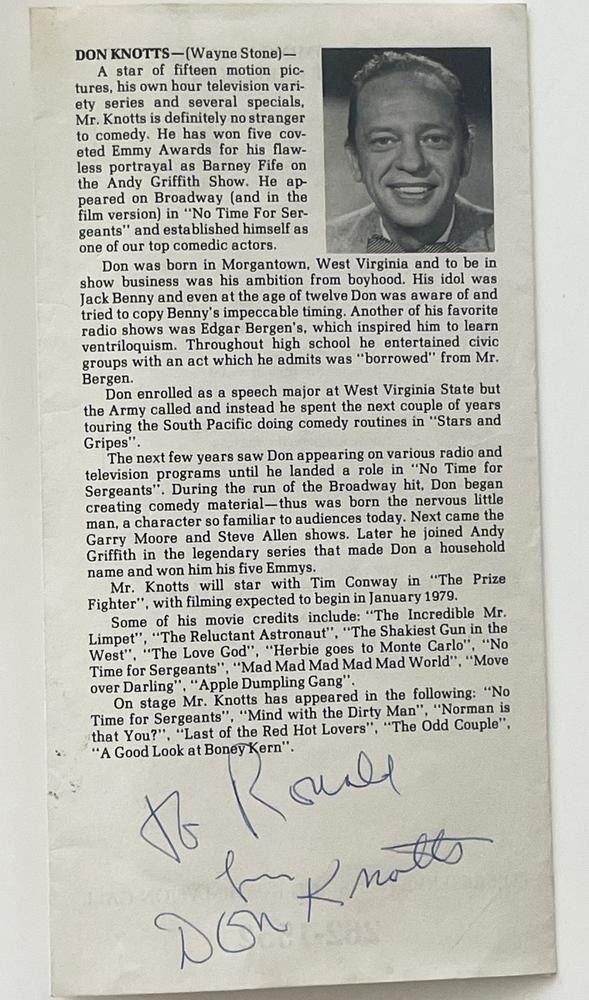 Don Knotts signed theatre pamphlet. 4x8 inches