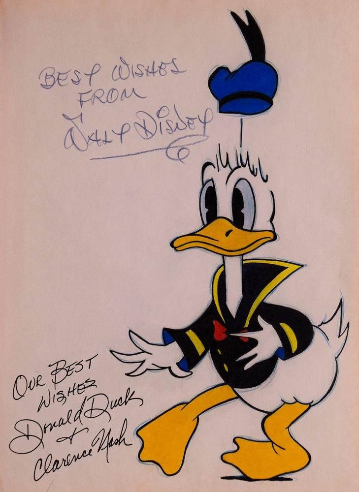 Hand Drawn Drawing of Donald Duck autographed Walt Disney and Clarence Nash. Signed: Best Wishes From Walt Disney & Our Best Wishes Donald Duck & Clarence Nash. 7 3/4 x 10 3/4 Inch