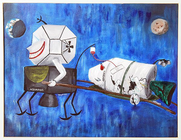 Donald Puddy�s Apollo 13 Caricature. In addition to many roles Don Puddy held at NASA one of his most important was serving as head of the team that came up with many of the lunar module lifeboat procedures that were eventually used after the Apollo 13 accident. To that point one of his coworkers painted this image of the lifesaving help he provided to the Apollo 13 crew and that would be available for following missions if necessary. There are 2 names on the painting "Hopkins" and "Marzano". Matt is 20 x 16", art is 14 x 11".