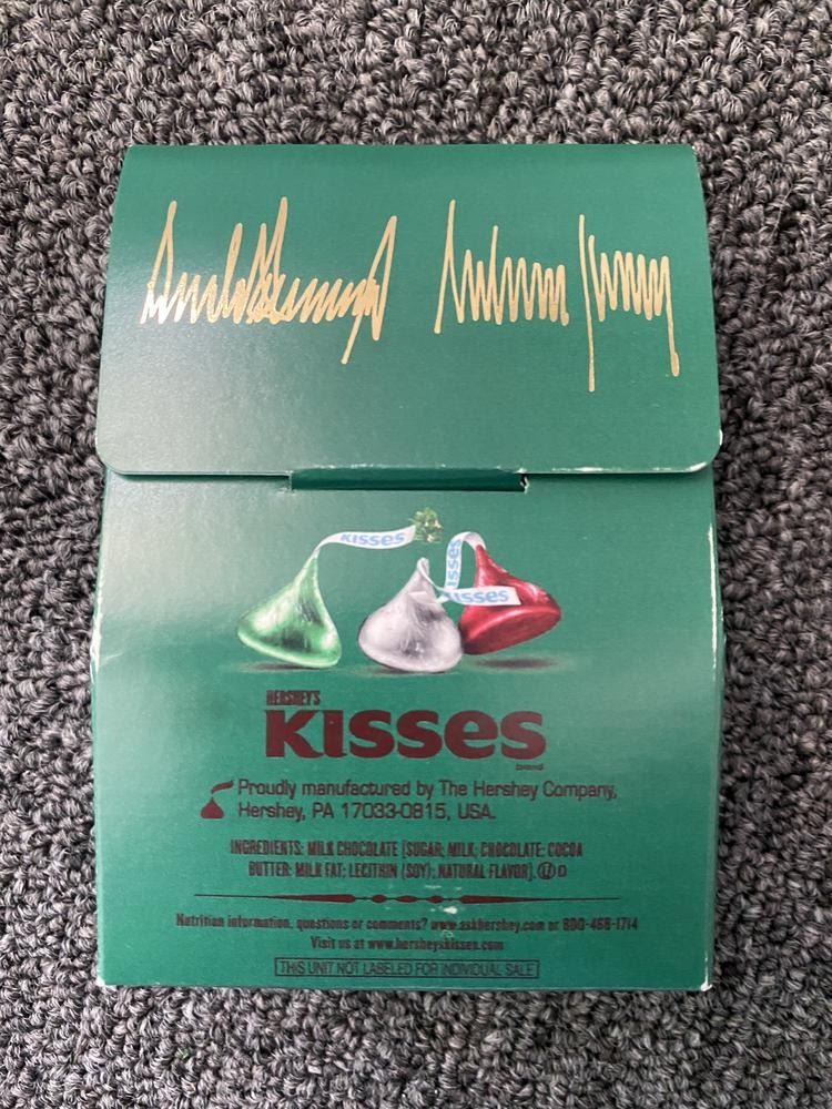 Mint unopened Hersheys Kisses from the 2018 Christmas celebration at the White House, only available to invited guests who visited the White House during the 2018 Holiday season. Beautiful gold foil embossing on the box, very presentable. These are limited editions and are no longer available at the White House or aboard Air Force One after the Holidays. Donald & Melania Trump facsimile signed holiday Hershey's Kisses chocolate box-Christmas at the White House 2018- 3x4 inches