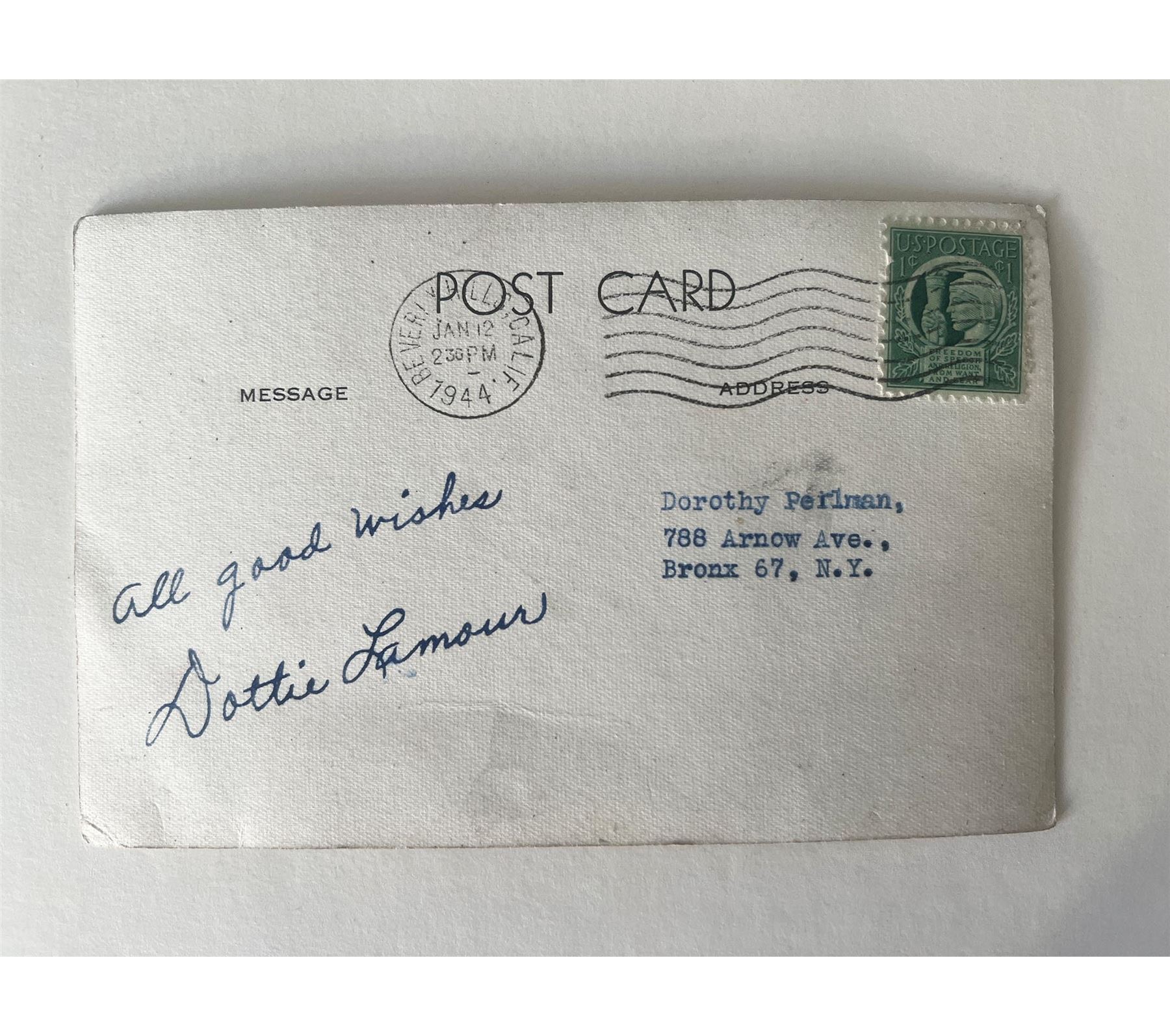 Dorothy Lamour signed postcard 3.5x5 - January 12th 1944