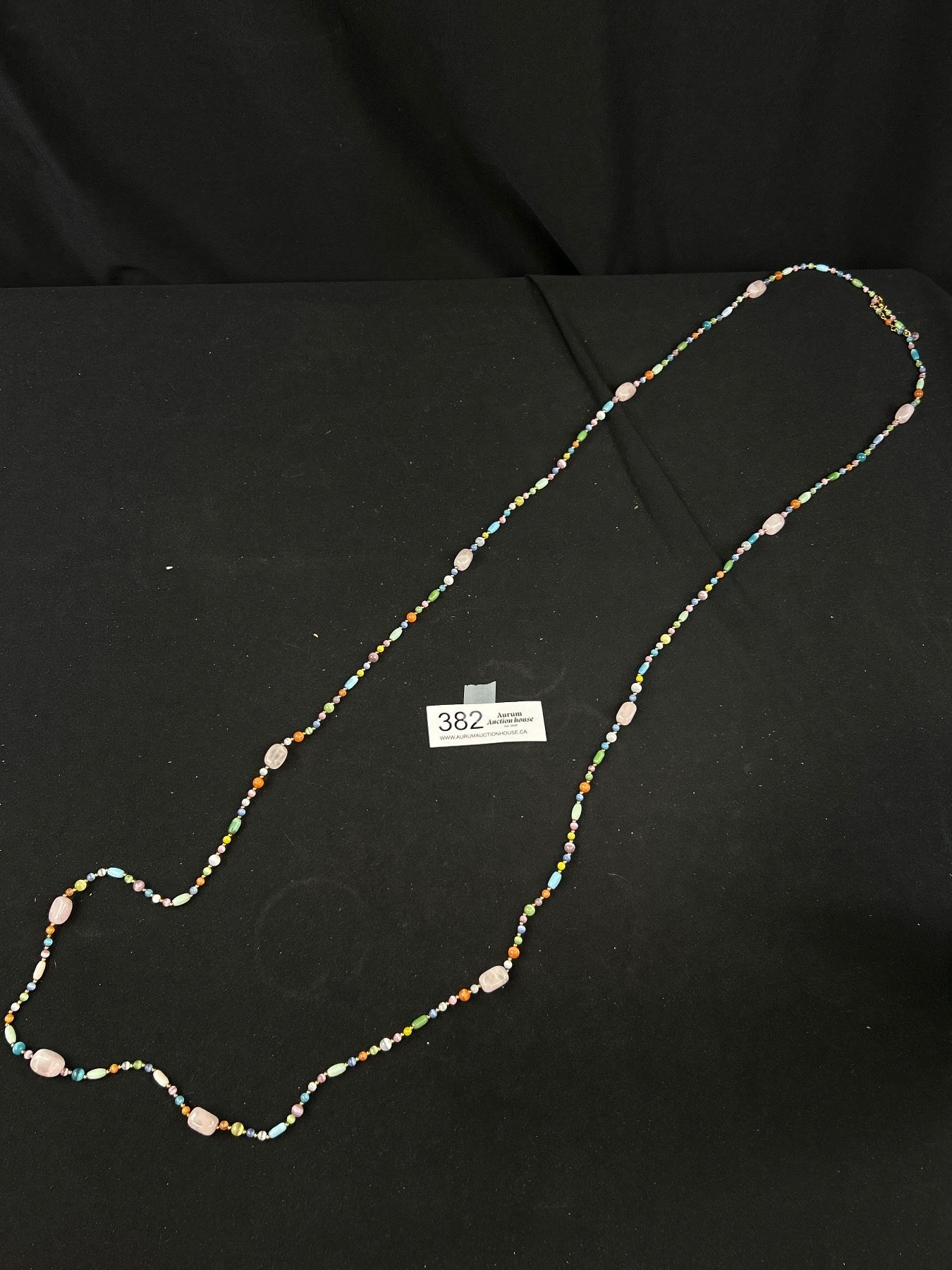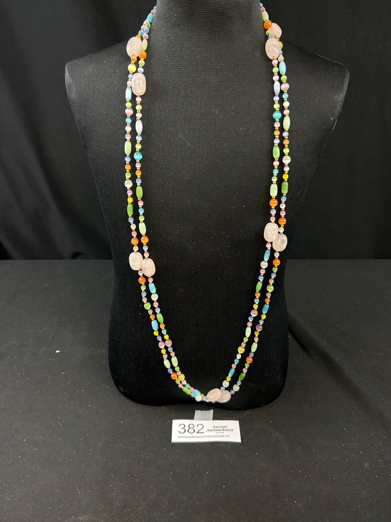 Double Length Rose Quartz Stones + Glass Beads Necklace, 69" Length