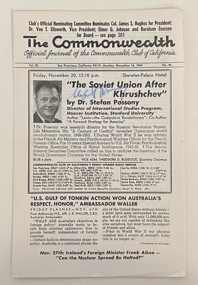 Dr.Stefan Possony signed Commonwealth Journal newspaper. San Francisco, California. November 16, 1964.6x9 inches