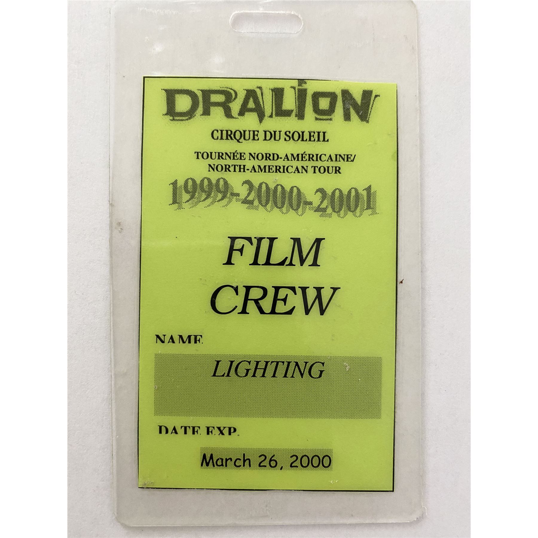 Dralion Cirque du Soleil 1999 - 2000 - 2001 Film Crew Pass