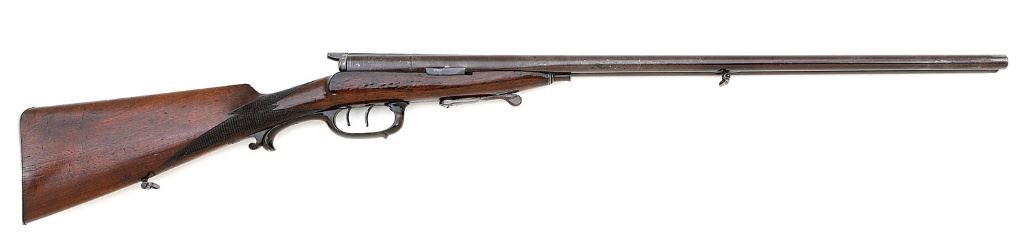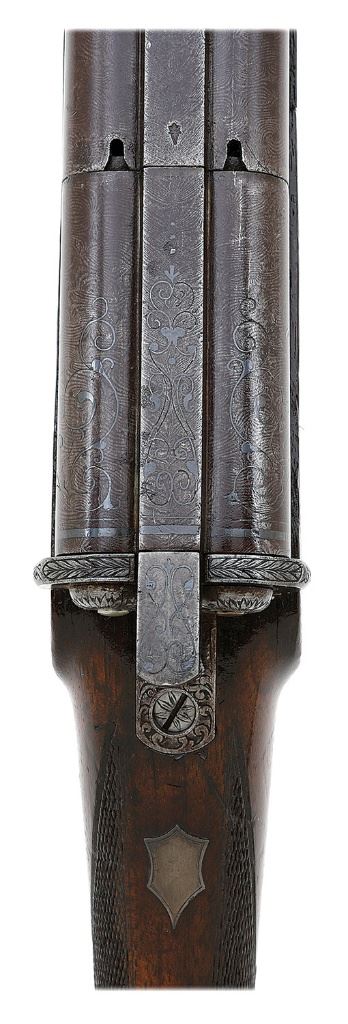 serial #744, 16 bore, 29'' damascus barrels with partially bright fair bores showing moderate pitting and old oxidation throughout. The barrels retain perhaps 60% original plum-brown finish with scattered fading, thin scratches and handling marks, otherwise retaining nice swirling damascus patterns throughout. The rib shows maker name inlaid in silver and there are some additional lovely silver inlaid bands and foliate motifs throughout the breech area. The barrels also show the ''(Crown) / V'' 1891 voluntary proof. The remaining metal surfaces show nice foliate scrollwork engraving and the horn triggerguard remains in very good plus condition showing a few light dings and a couple of hairline cracks forming. The barrel lever shows an old brazed repair and its screw appears to be a later replacement, it is also inlaid in silver with a nice little recumbent dog. The checkered walnut stock with rounded left-side cheekpiece remains in about very good plus condition showing some overall light dings and handling marks with un-engraved silver monogram shield atop the wrist. Strangely, this example is equipped with a tailpipe and lip at muzzle end of barrels suggesting the fitting of a cleaning or ram rod though it also has what are obviously factory sling swivels which would preclude a rod. This example is equipped with the later self-cocking system, the needles are not present and the left needle retainer is a replacement however the right is stamp-numbered matching the gun and the action otherwise seems to function normally. A very good and rather seldom-seen example of Dreyse's famous needle fire system. (13B11649-5) {ANTIQUE} (800/1200)