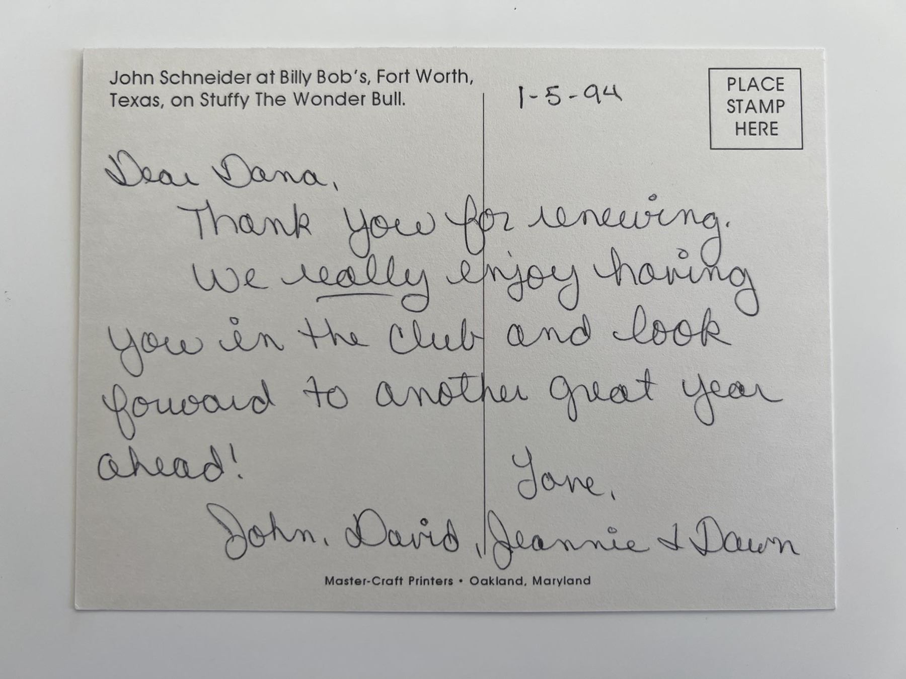 John Schneider signed post card. 6x4 inches