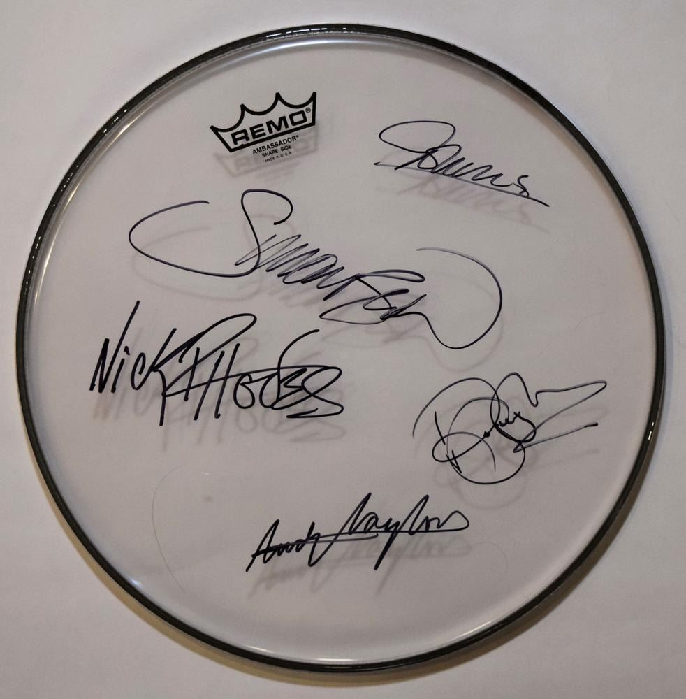 Duran Duran 14 Inch Drumhead. Signed: Simon Le Bon, Nick Rhodes, Andy Taylor, John Taylor, and Roger Taylor.