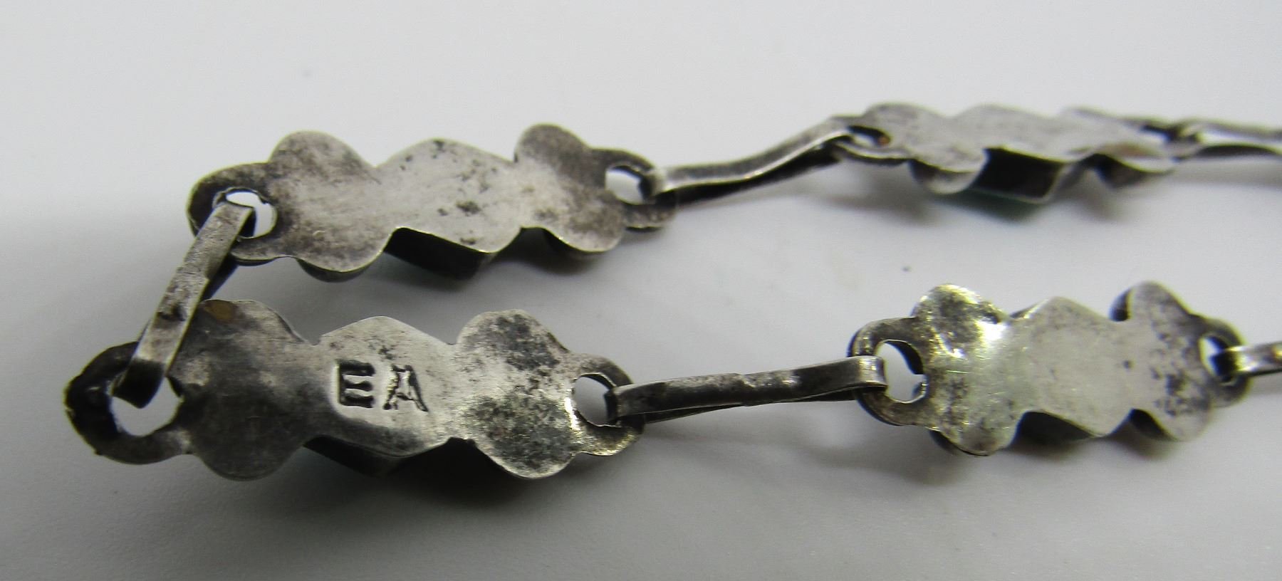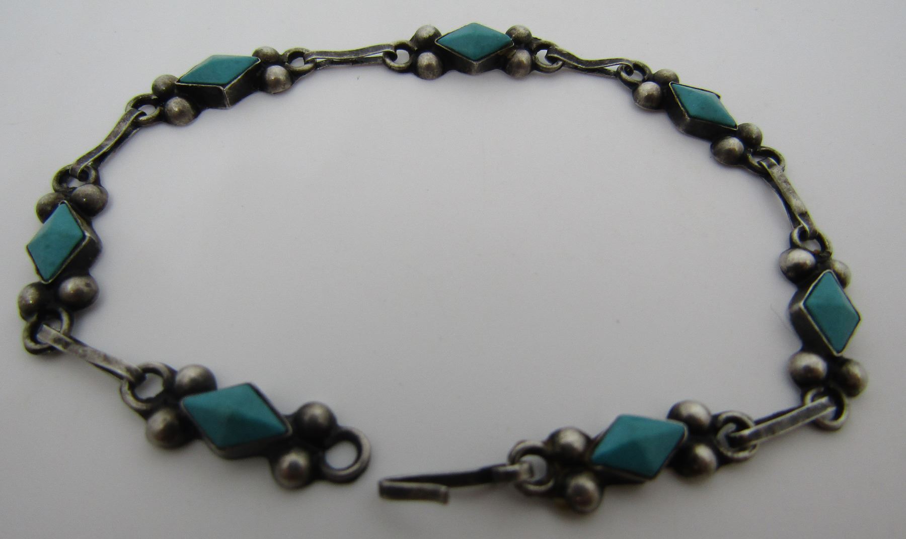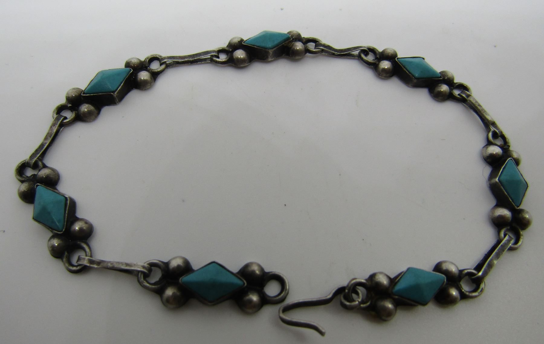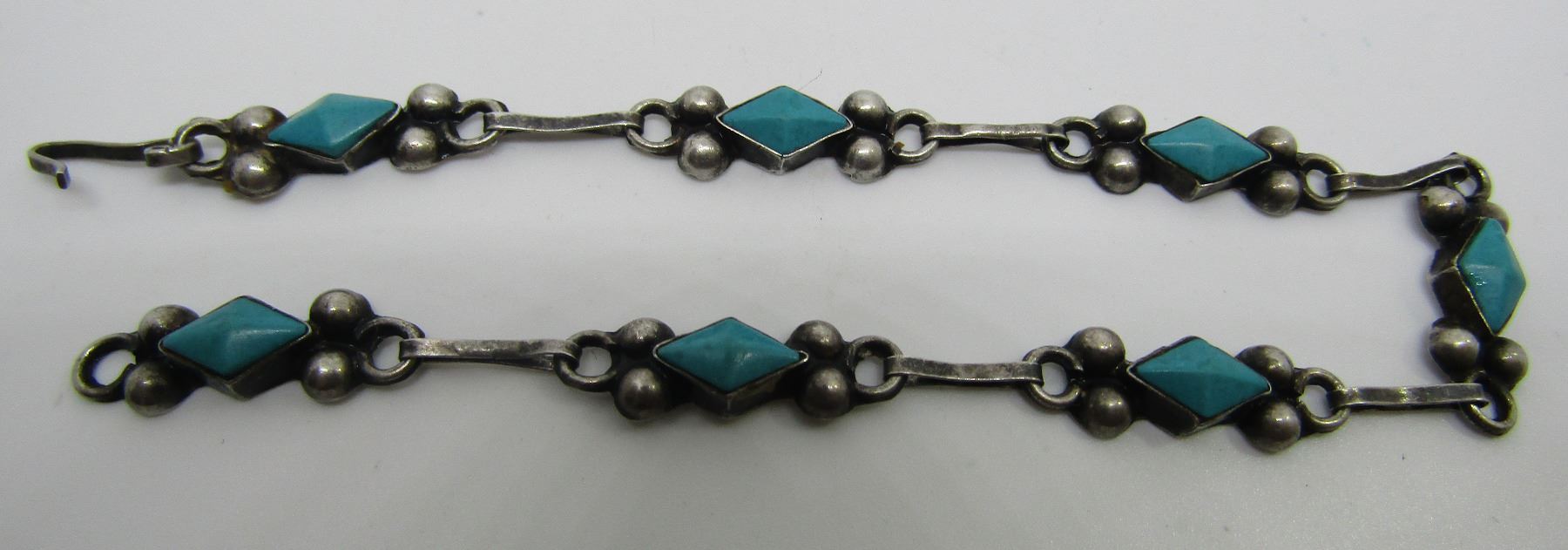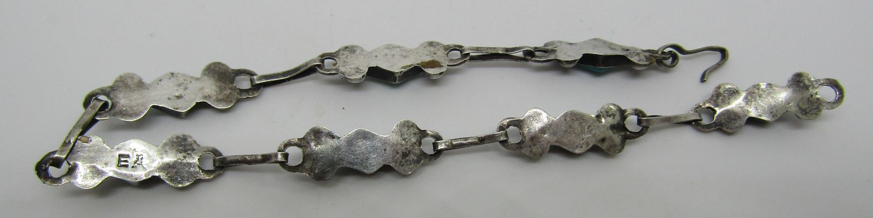 SIGNED "EA" . UNMARKED BUT TESTED STERLING SILVER. MEASURES 7 INCHES LONG. VINTAGE ESTATE NATIVE AMERICAN SOUTHWEST INDIAN JEWELRY. EXCELLENT CONDITION BEZEL MOUNTED WITH 7 PETIT POINT DIAMOND SHAPED TURQUOISESTONE LINKS. WEIGHS 3.1 GRAMS. SILVER LINKS IN USED CONDITION. USA SHIPPING $5.