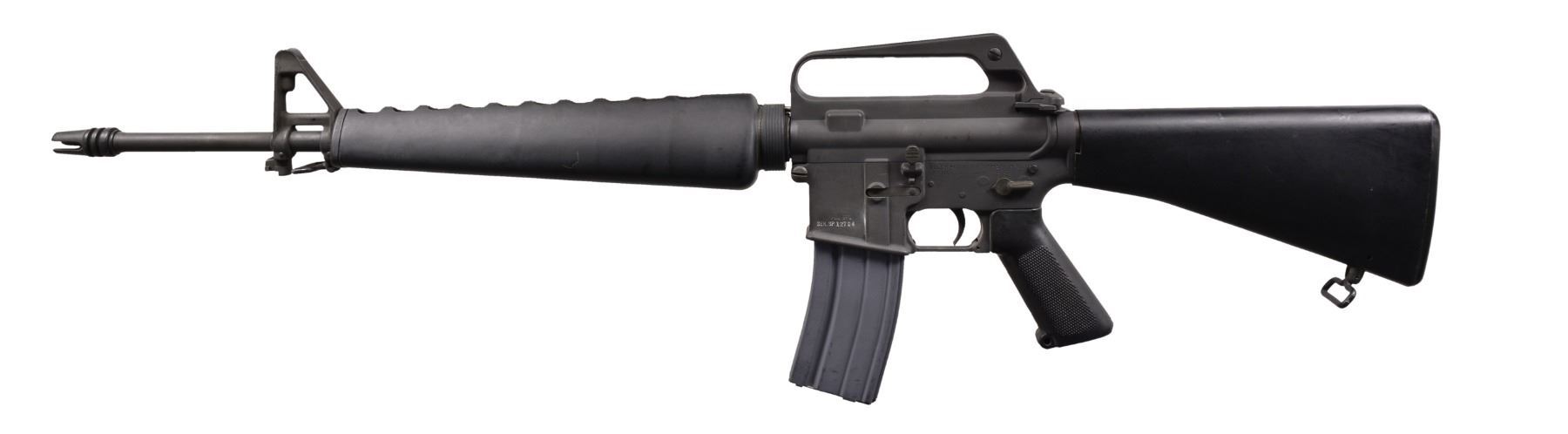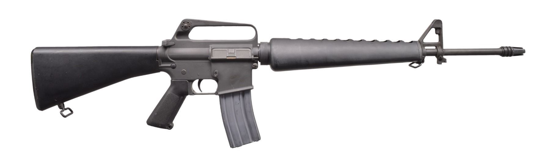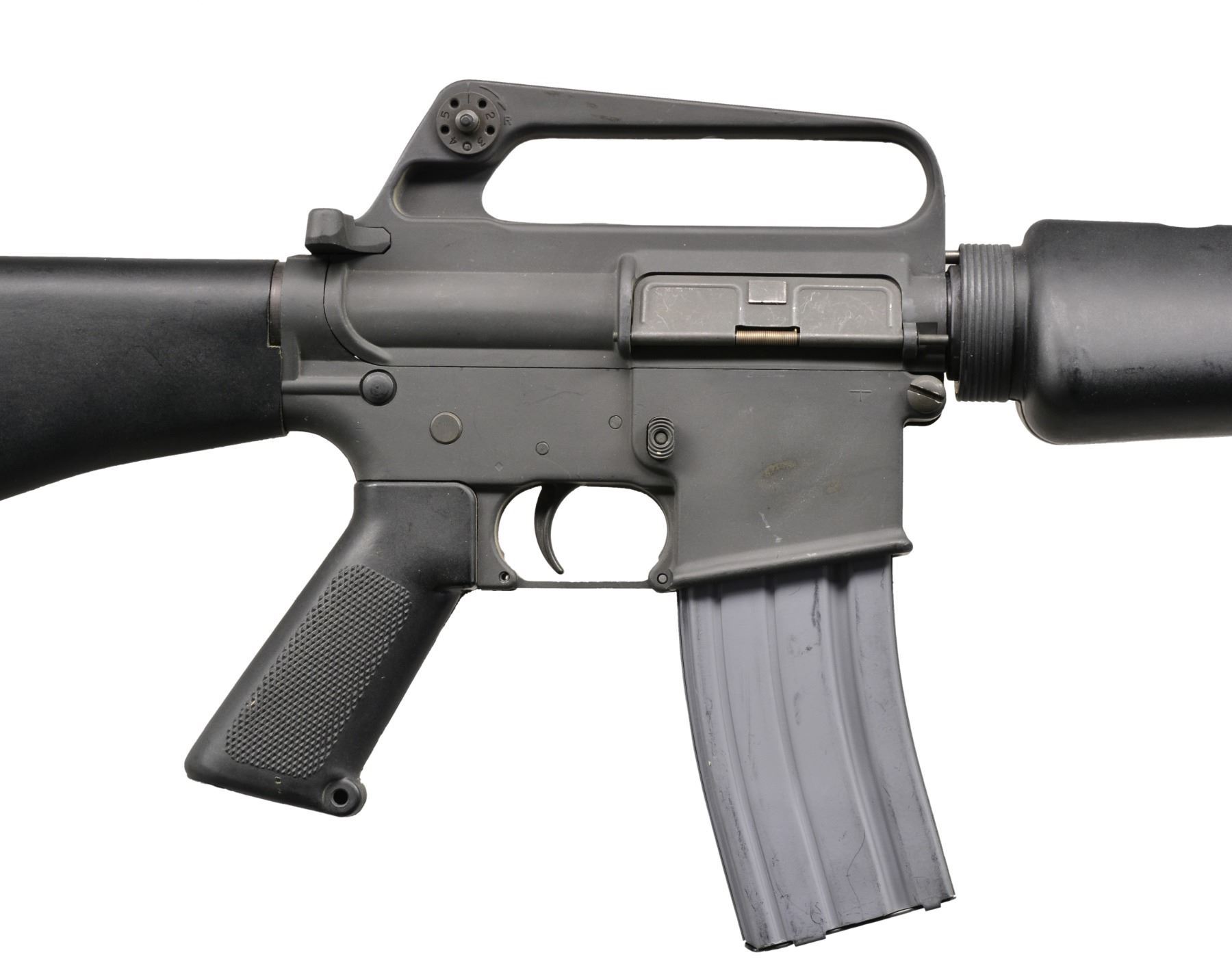 Cal. 223. S# SP12794. Bbl. 20" pencil. 1968 Mfg. 3 Prong flash hider. Beavertail handguards. Flat Delta ring. Slab side lower receiver. Carry handle upper receiver w/ windage adj. flip up rear sight. Traditional elevation adj. protected post front sight w/ bayonet lug. No forward assist. Front takedown screw. 10" Rear stock w/ factory soft buttplate. No trapdoor. Bottom sling swivels front & rear. MAGS: 1 OKAY Industries aluminum 30 rd. CONDITION: worn bore retaining decent rifling. Black plastic furniture free of any significant blemishing. Parkerized finish on receivers is uniform w/ light thinning on right side of magwell. Approx. 1/2" behind takedown pin at same elevation is a "+" sign measuring approx. 1/4" X 1/4" that lightly protrudes from the receiver. Fire control mechanism appears to function correctly when cycled by hand. (19-5895/JZ). CURIO. $800-1,200.