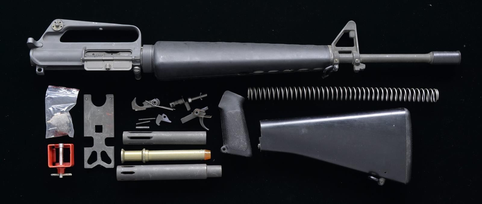 These are all the parts that were removed from an early SP1 lower receiver. Complete, barreled upper receiver w/ straight delta ring, beaver tail handguards, SP1 style bolt carrier & bolt, A2 flash hider, plastic muzzle cap, charging handle, stock, buffer as well as buffer spring, pistol grip & fire control group from original rifle. Also included is 5.5" flash hider, 7" flash hider, both of which are threaded 1/2x28. Traditional birdcage blank adapter. Hollywood blank adapter. After market armorer’s wrench. Proper period sight adj. tool. (02-13777-6/JZ). $300-600.