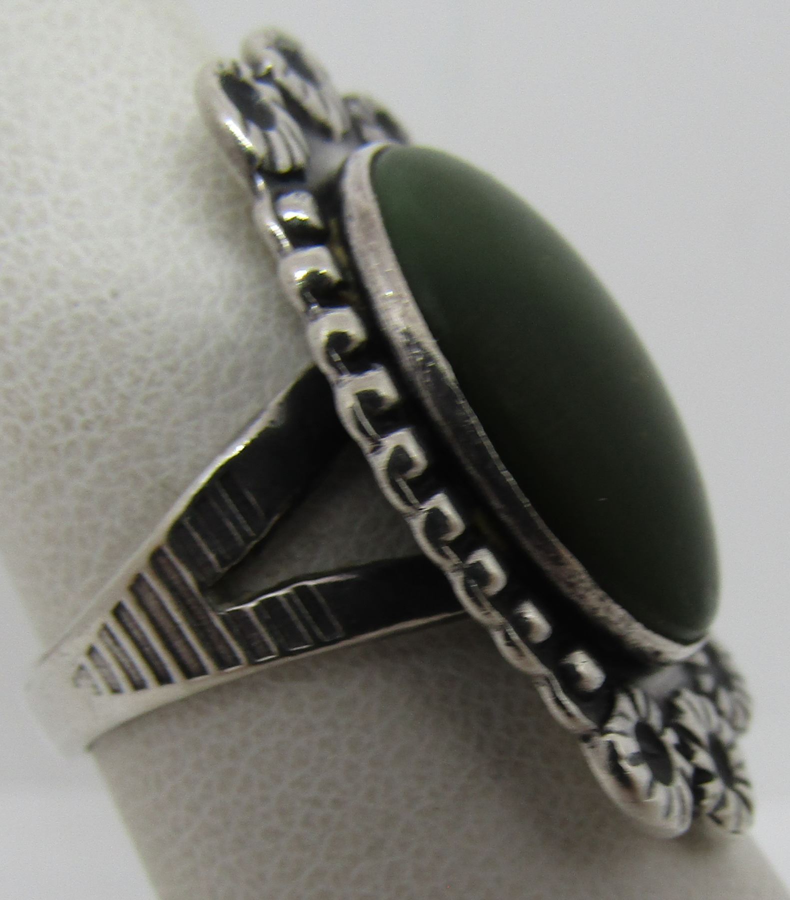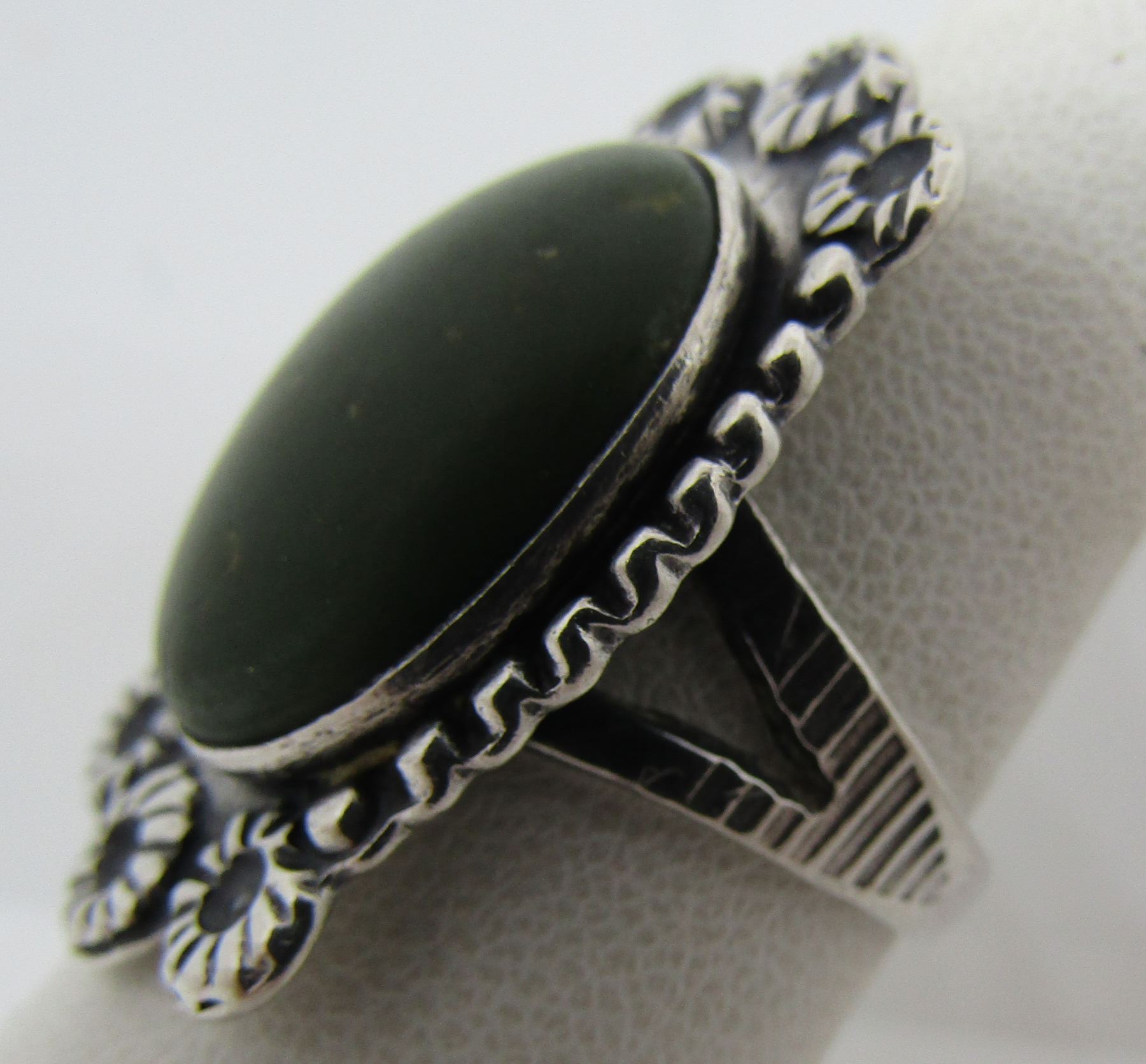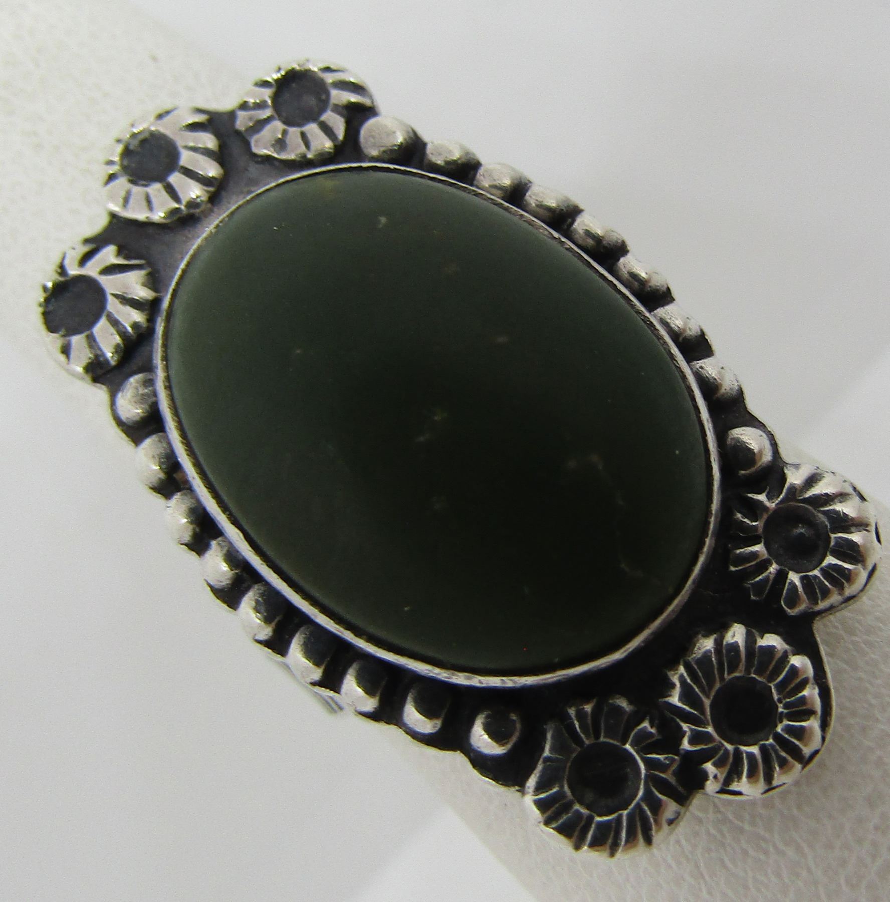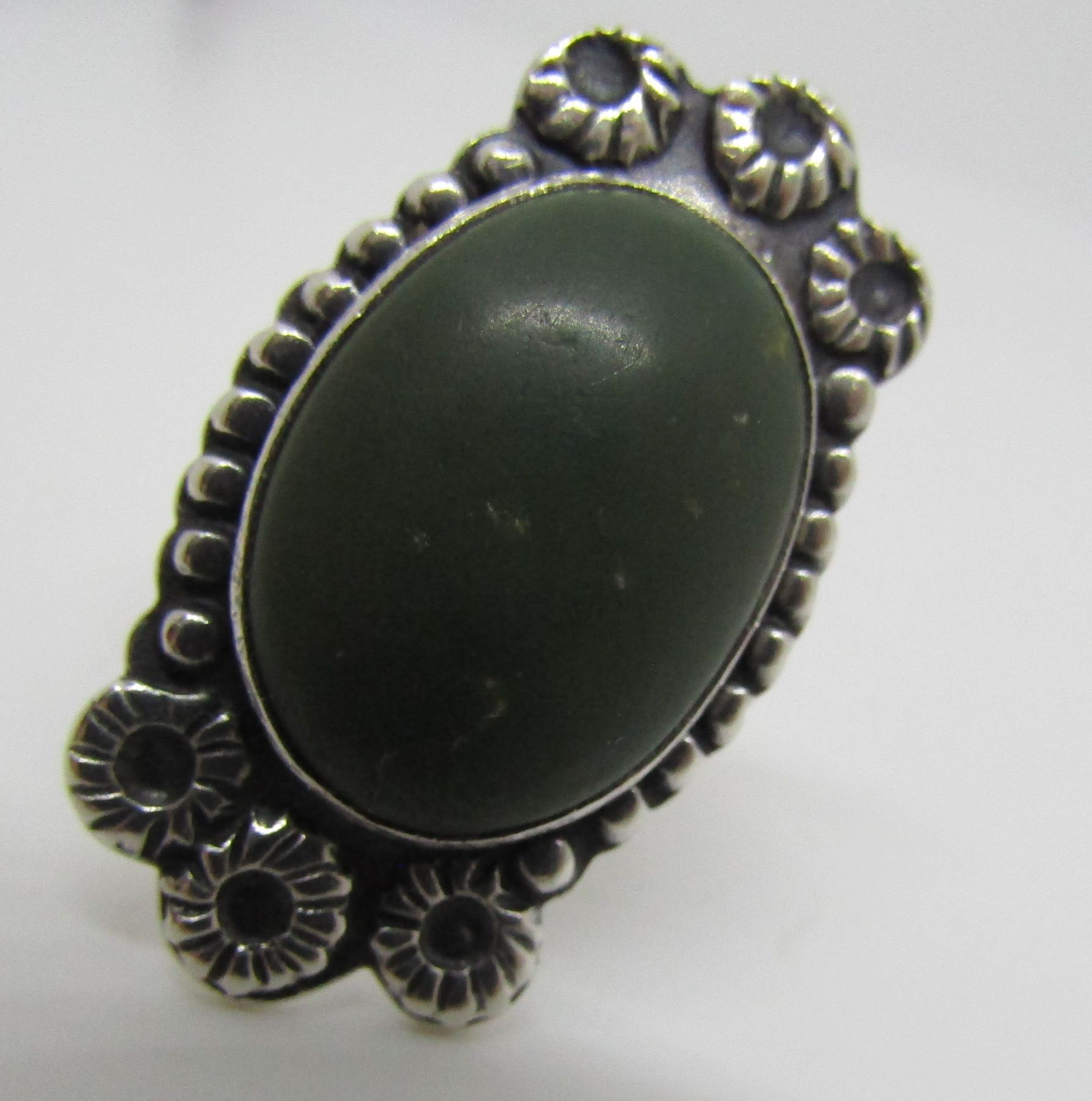 UNMARKED TESTED STERLING SILVER. STARBURST DESIGN VINTAGE ESTATE NATIVE AMERICAN SOUTHWEST INDIAN JEWELRY. BEZEL MOUNTED WITH 1 GREEN TURQUOISE STONE. TOP MEASURES 18MM WIDE BY 32MM LONG.. WEIGHS 9.3GRAMS. SIZE 7.5. USA SHIPPING $5.