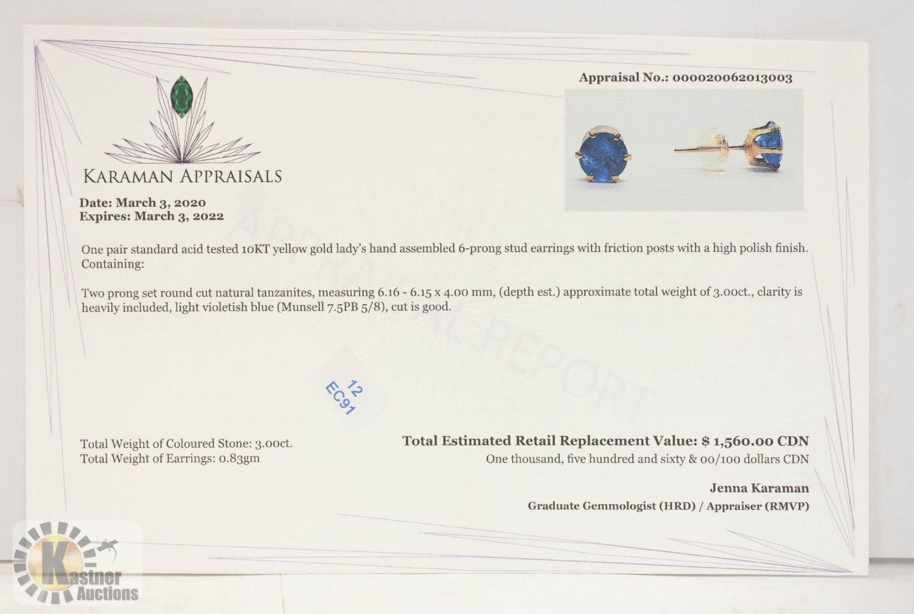 6 PRONG SET, NATURAL ROUND TANZANITES MEASURING 6.16 X 6.15 X 4.00 mm. APPROXIMATE TOTAL WEIGHT OF 3.00CT. CLARITY IS HEAVILY INCLUDED. LIGHT VIOLET BLUE. CUT IS GOOD. ESTIMATED RETAIL REPLACEMENT VALUE OF $1560.00 CAD.