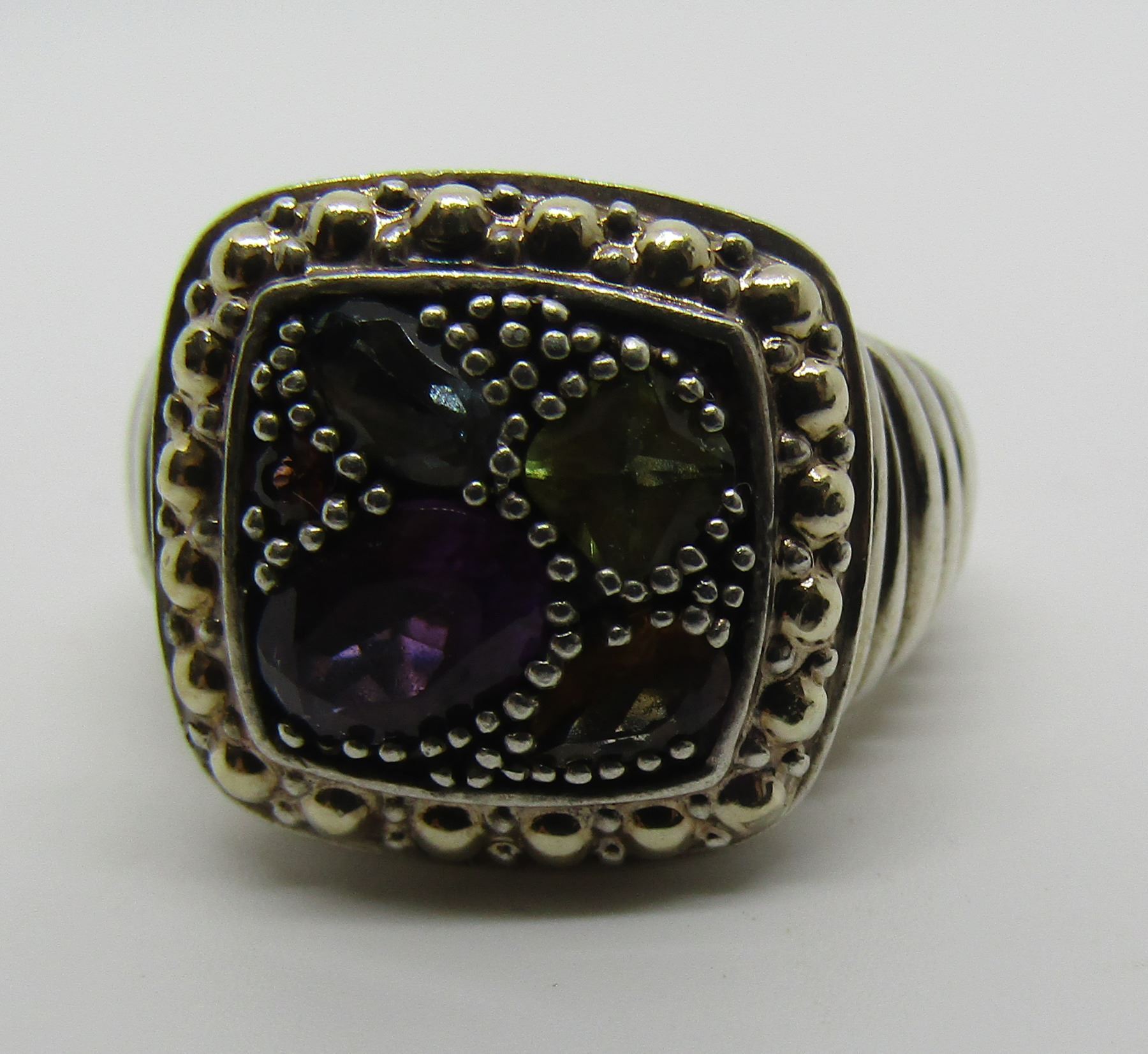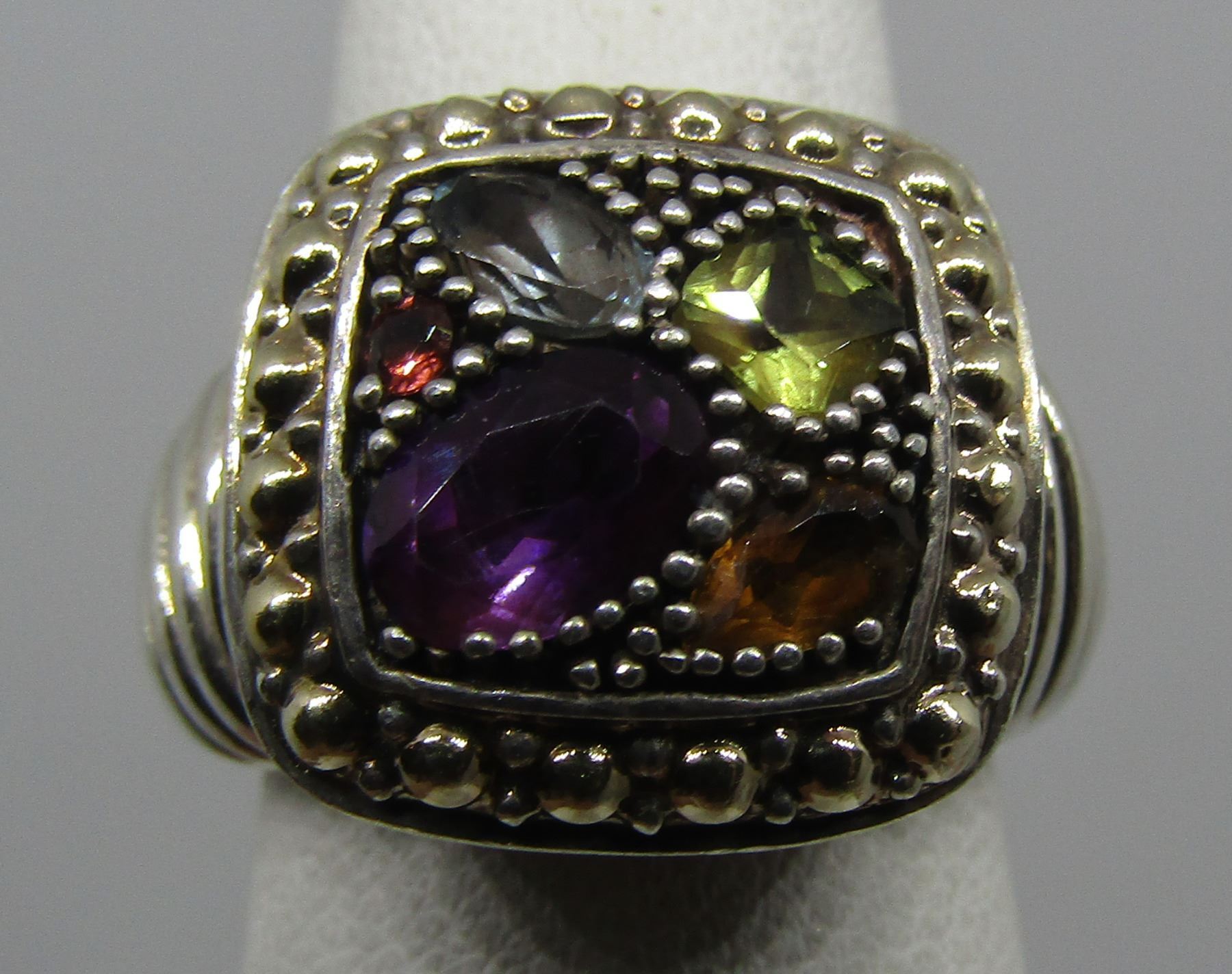 VINTAGE ESTATE BALISSIMA DESIGN MULTI GEMSTONE RING. HALLMARKED "BH, 925, 18K" 18K YELLOW GOLD ON STERLING SILVER WITH AMETHYST, PERIDOT, CITRINE, GARNET & TOPAZ. TOP 17MM BY 17MM. SIZE 8. WEIGHS 12.7GRAMS. EXCELLENT USED CONDITION. USA SHIPPING $5.