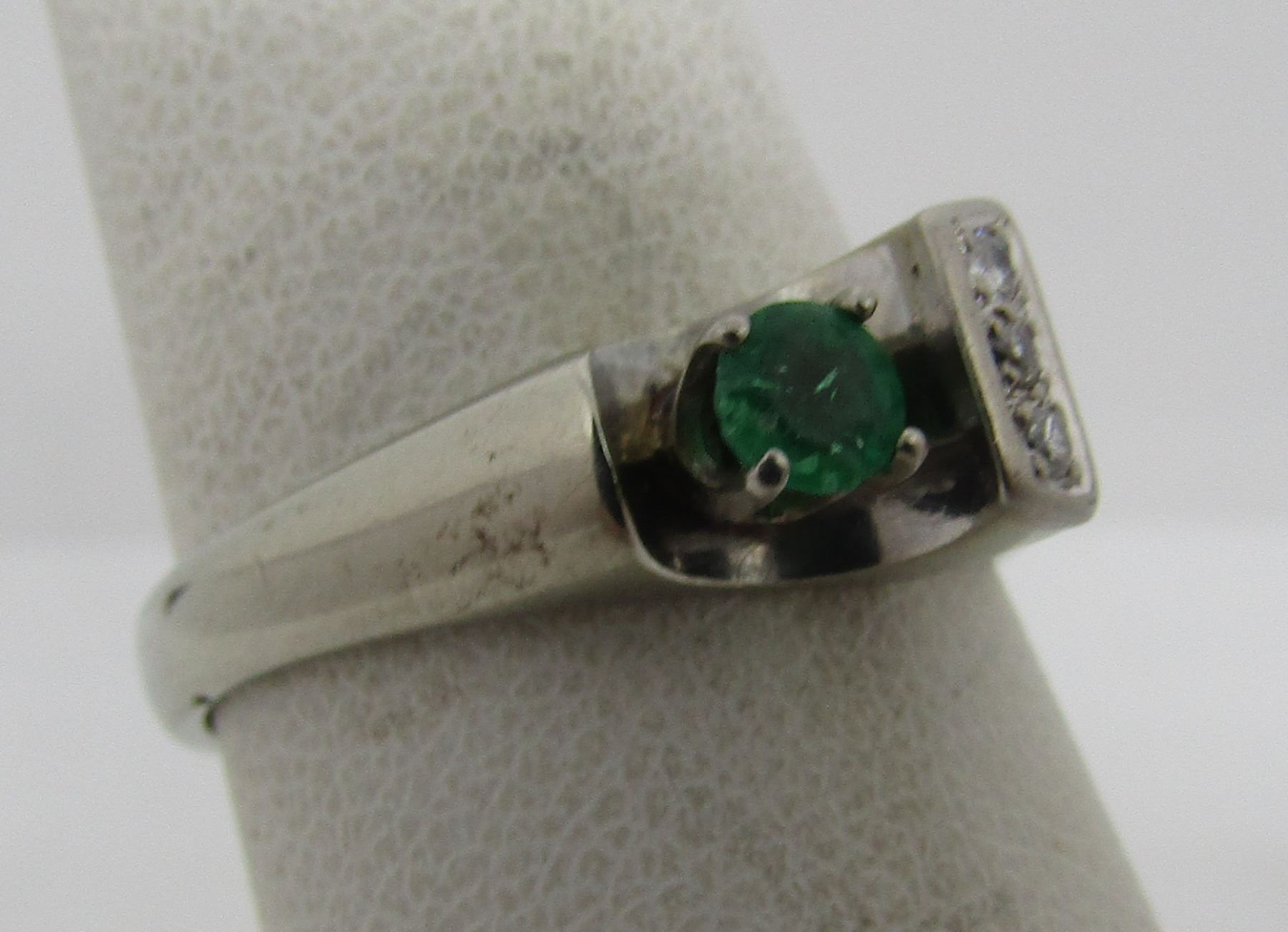 GENUINE EMERALD AND 3 DIAMOND RING. MARKED "585" WHITE GOLD, WEIGHS 3.4 GRAMS. 6.5 MM WIDE. SIZE 7. EXCELLENT CONDITION VINTAGE ESTATE. USA SHIPPING $5