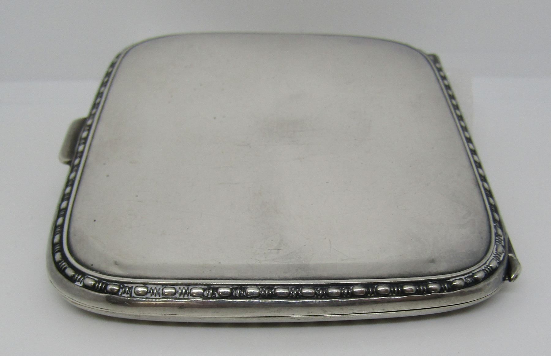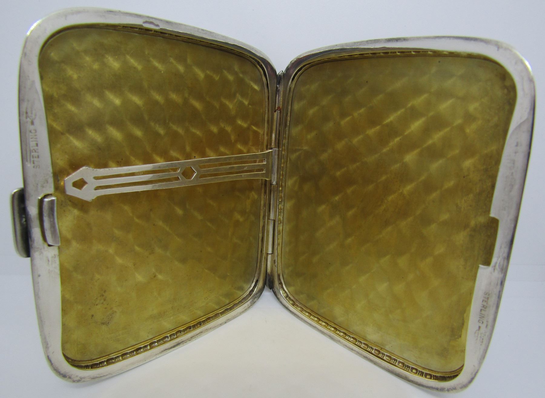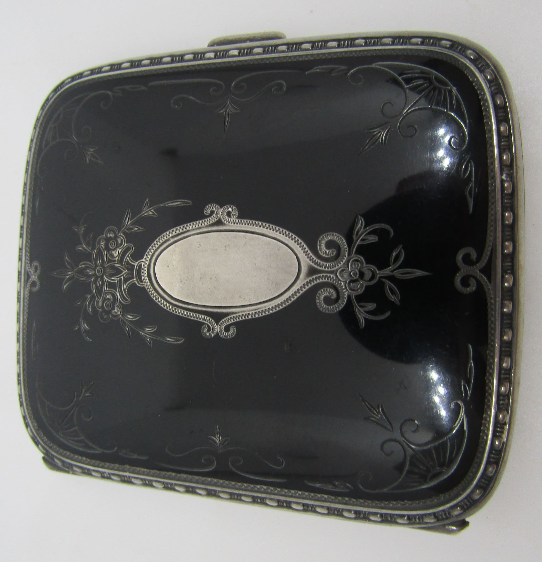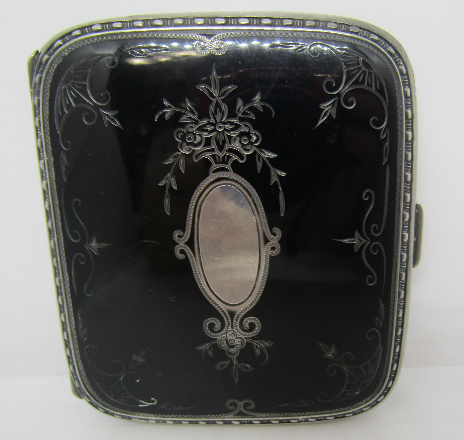 BLACK ENAMEL WITH ORNATE SCROLLWORK. HALLMARKED "WCO WITH AN ARROW & STERLING". WEBSTER CO. 1894 LATER REED & BARTON. WITH A GOLD GILT INTERIOR. MEASURES 83MM BY 72MM. WEIGHS 64.7 GRAMS. VINTAGE ESTATE USEDCONDITION. USA SHIPPING $8.
