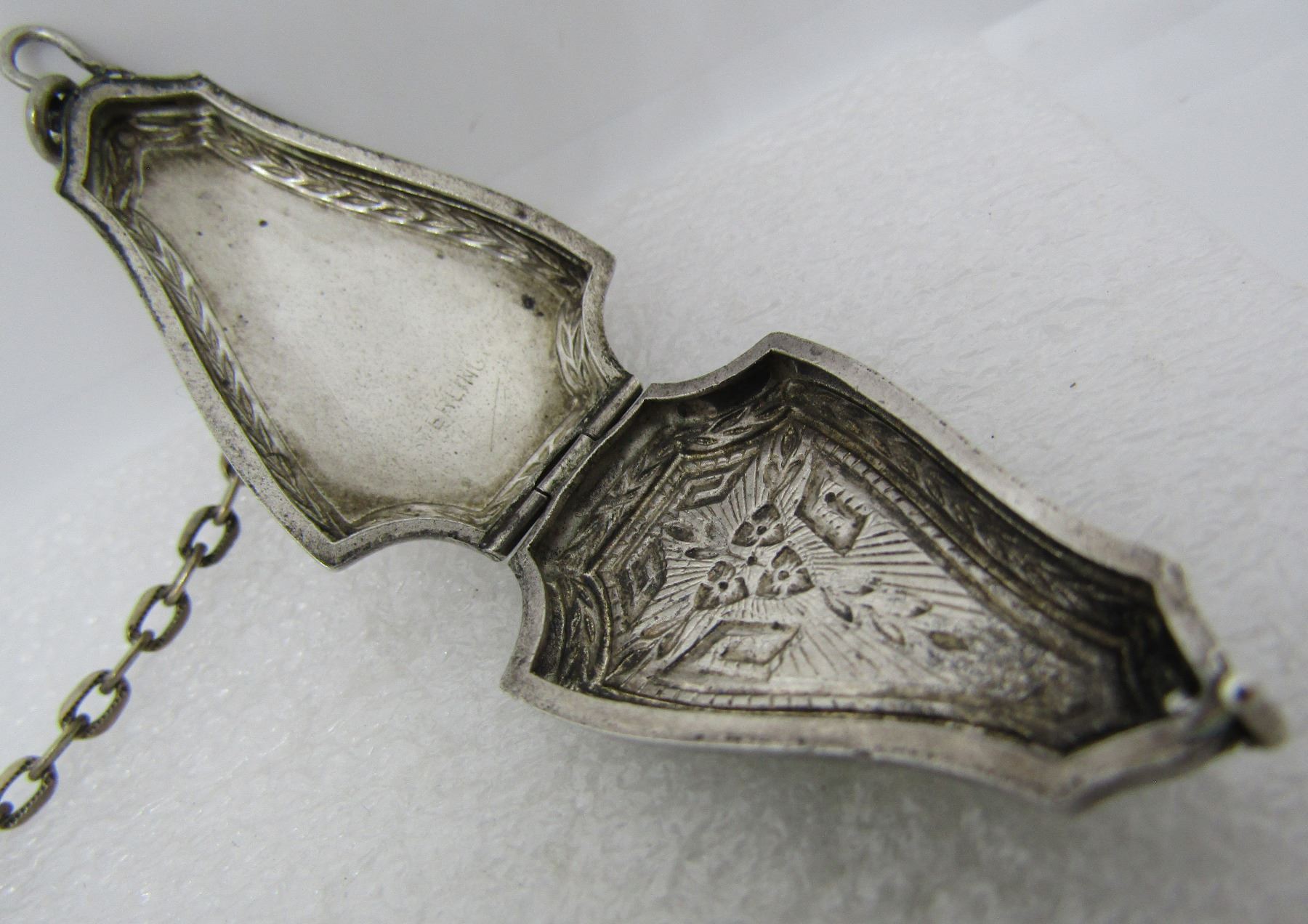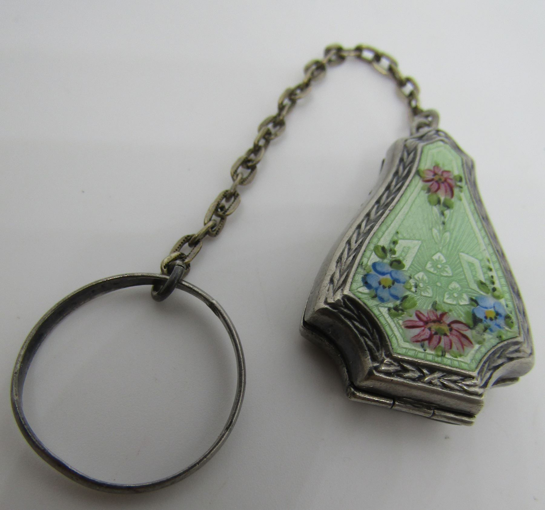 ANTIQUE 5 INCH LONG RING, CHAIN AND PURSE. SIZE 9. PURSE 38MM BY 23MM BY 8MM. WEIGHS 9 GRAMS. USA SHIPPING $5.