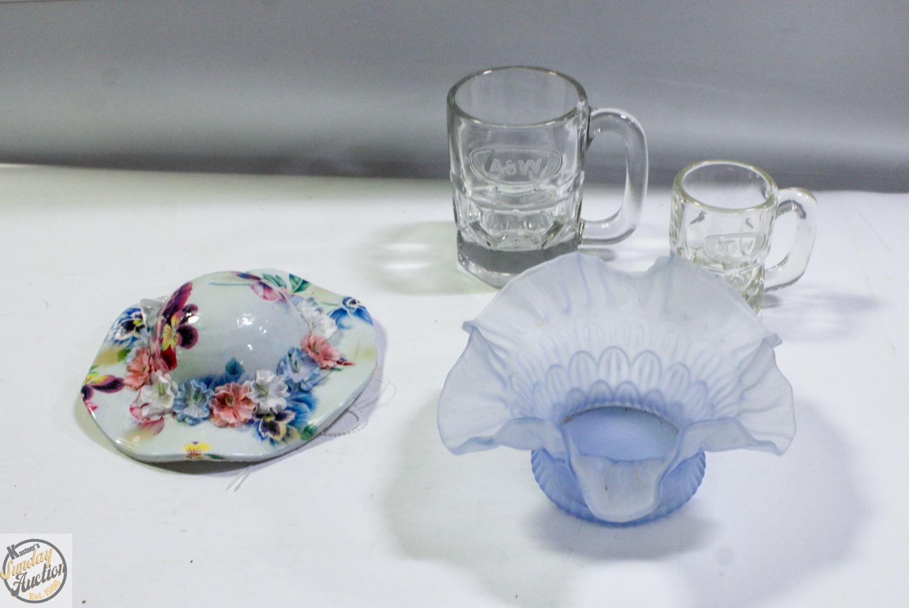 MADE IN CANADA BY LINDA EDGINGTON HAT WALL HANGING FELTED BACKING + 2 THICK GLASS VINTAGE A&W HANDLED MUGS **ALL ITEMS MUST BE REMOVED BY 5PM SATURDAY, JANUARY 17TH 2026. ALL REMAINING ITEMS WILL BE SUBJECT TO A $6.00 PER DAY STORAGE CHARGE. ANY ITEMS REMAINING AFTER MONDAY, FEBRUARY 2ND 2026 WILL BE CONSIDERED FORFEITED. NO REFUNDS WILL BE ISSUED FOR FORFEITED ITEMS. TO SCHEDULE A PICK UP APPOINTMENT CLICK HERE