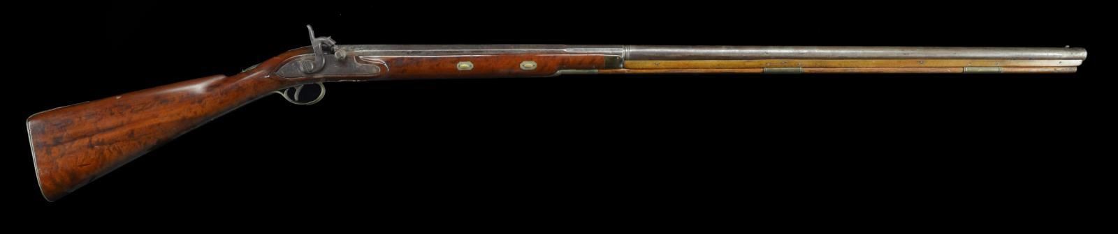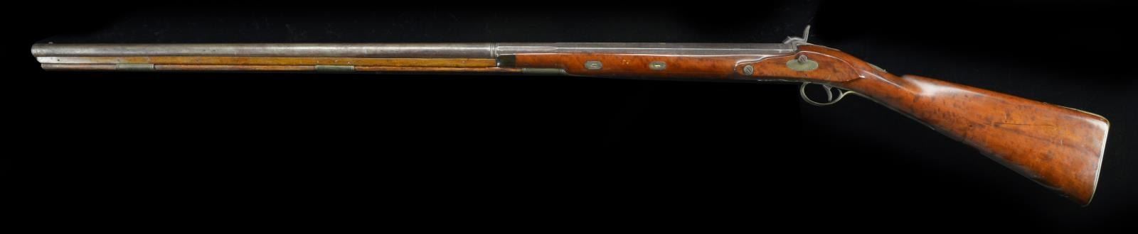 O. WARE 52 Cal. smooth bore, 38" octagon to rnd. half stock percussion gun signed "O. Ware". Unmarked percussion lock. Bbl. is fastened to the lock w/ 2 wedges & has a full wooden rib. The trigger guard ends in a pineapple shaped finial. Orlando Ware worked in Worcester Massachusetts, 1842-1849. CONDITION: like new. PROVENANCE: Estate Collection of Jack Verret Sr. (01-20708/RG.) ANTIQUE. $1,000-1,500.