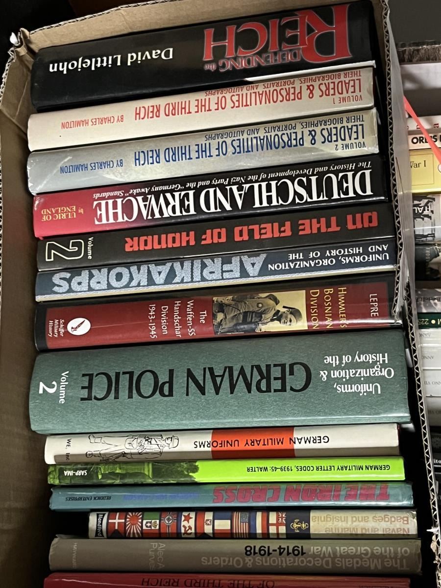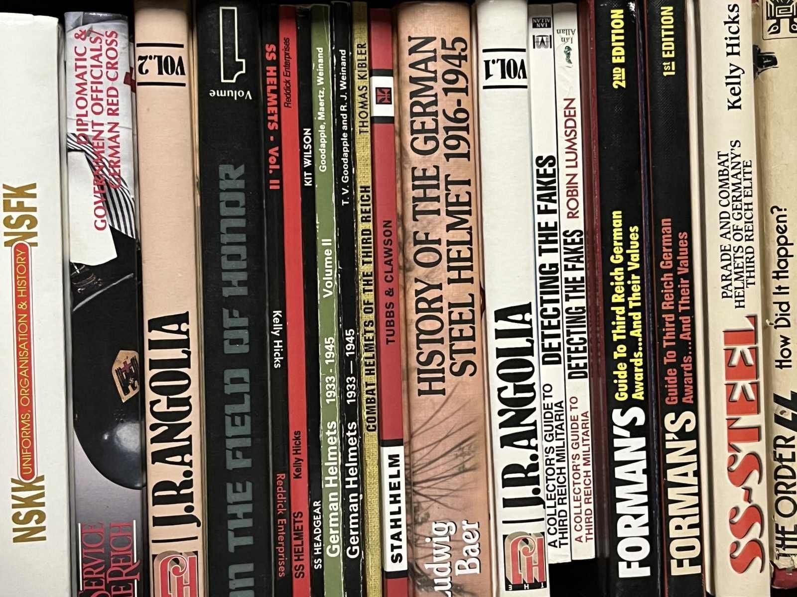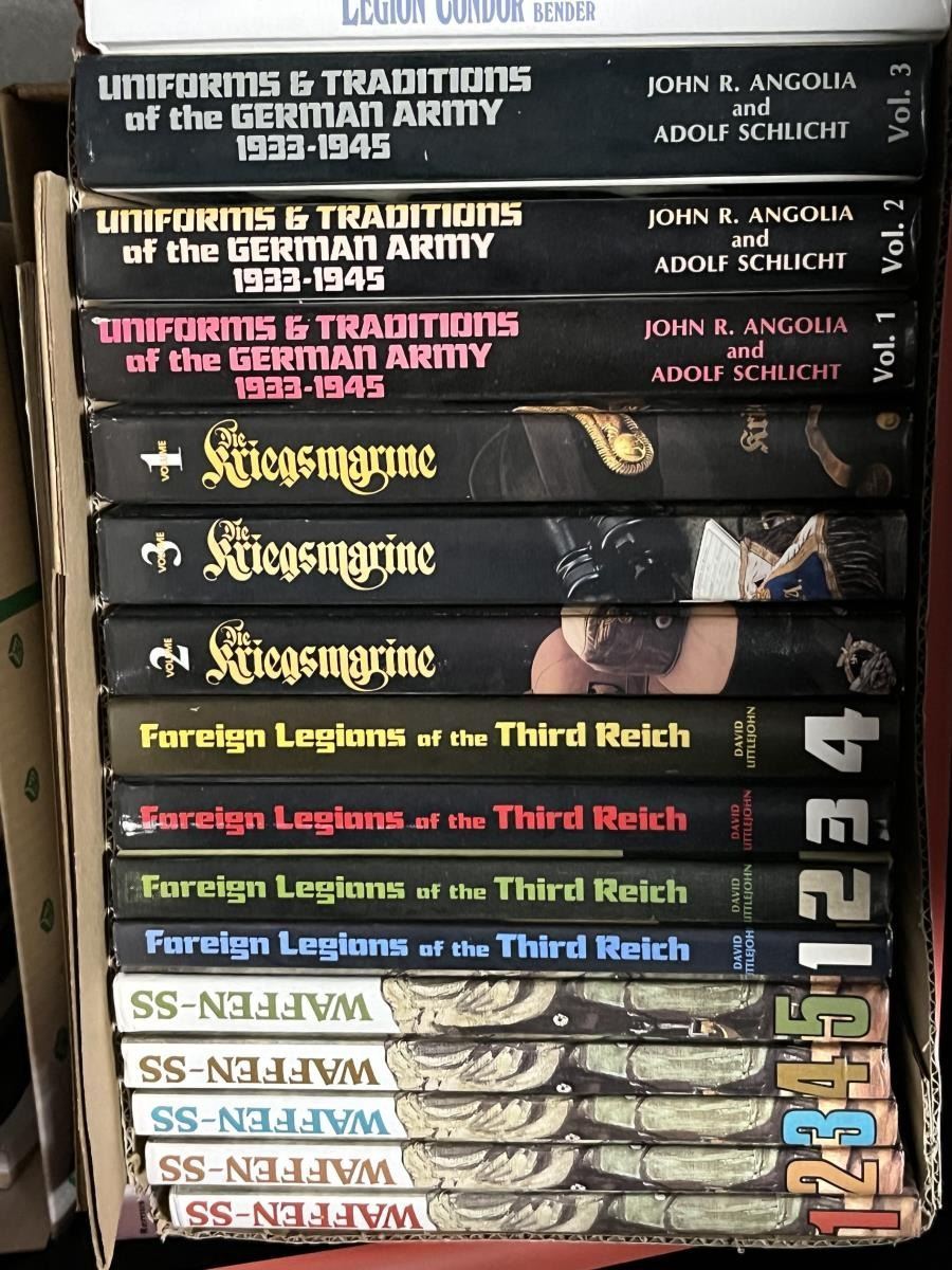 Notable GERMAN titles include: Wenn Alle Bruder Schweigen published by the Association of Soldiers of the Former Waffen-Shutz Staffel.(An extensive photographic record, this book is in fair condition. / The German Police by Munoz. / Legion Condor by Arias, Molina & Permuy. / Afrikakorps by Kurtz. / Foreign Legions of the Third Reich Vol 1 - 4 by Littlejohn. / Uniforms & TRaditions of the German Army 1933-1945 - Vol.1-3 by Angolia & Schlicht. / Die Kriegs- Marine Vols.1-3 by Angolia & Schlicht. / Germany's Combat Helmets 1933-1945 by Niewiarowicz. / NSKK & NSFK by Angolia & Littlejohn. / German Mountain Troops in WWII by Kaltenegger. / Uniforms of the Third Reich by Hayes & Maguire.