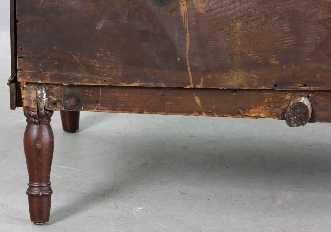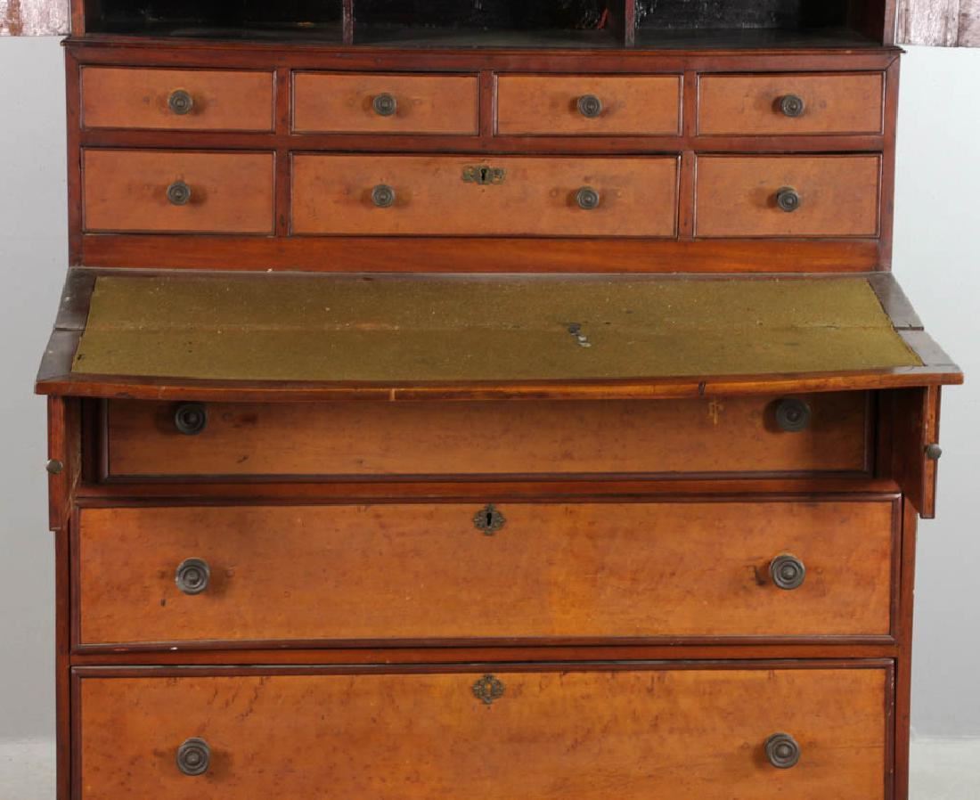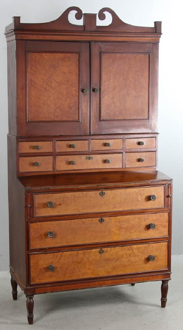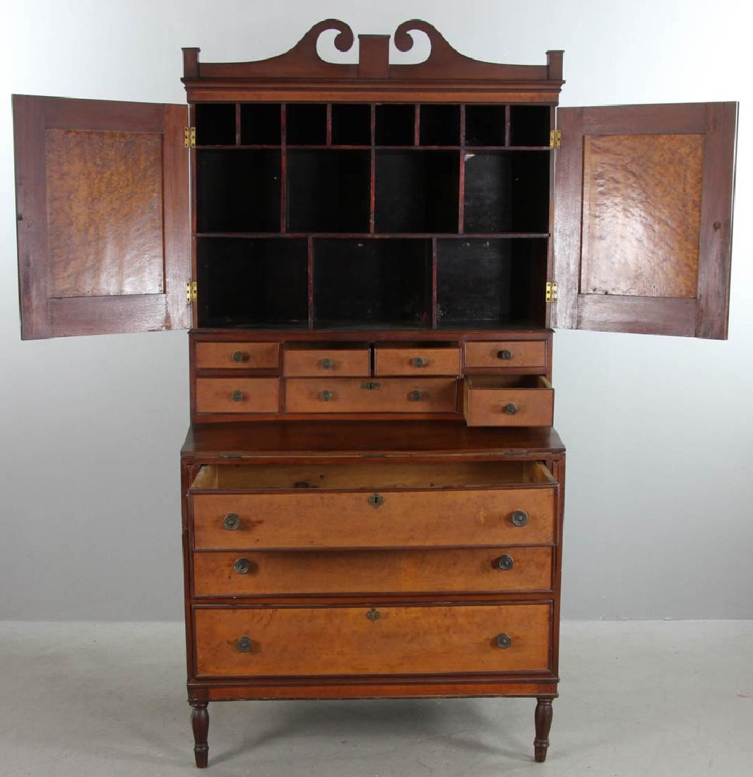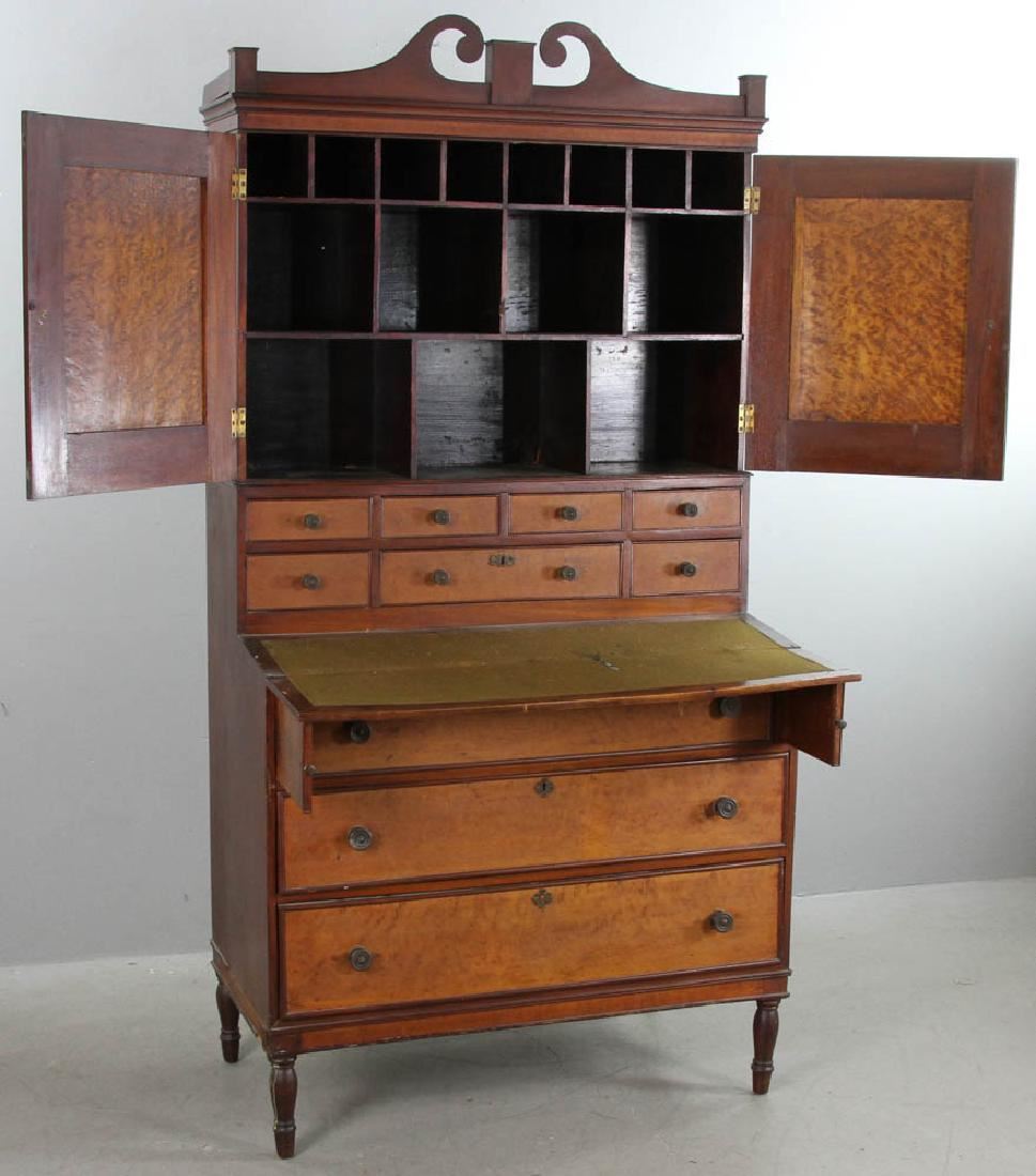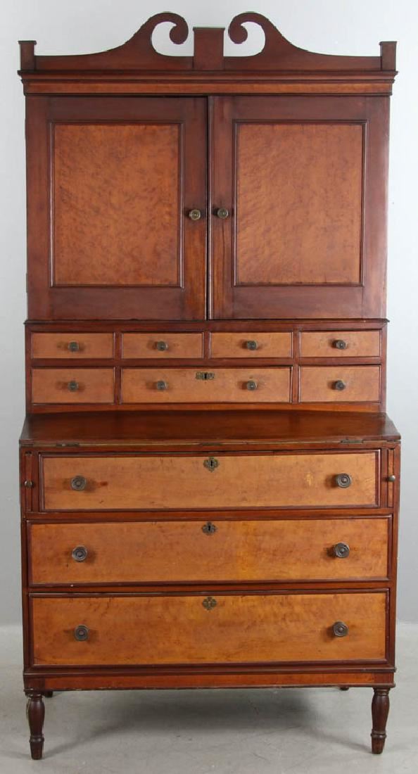 Early 19th century birdseye maple Federal secretary, upper case having arched pediment over two doors, lower case having ten assorted drawers, folding writing surface, retains original surface, 76 1/2" H x 38" W x 19 1/2" D. Provenance: Wakefield, Massachusetts estate.