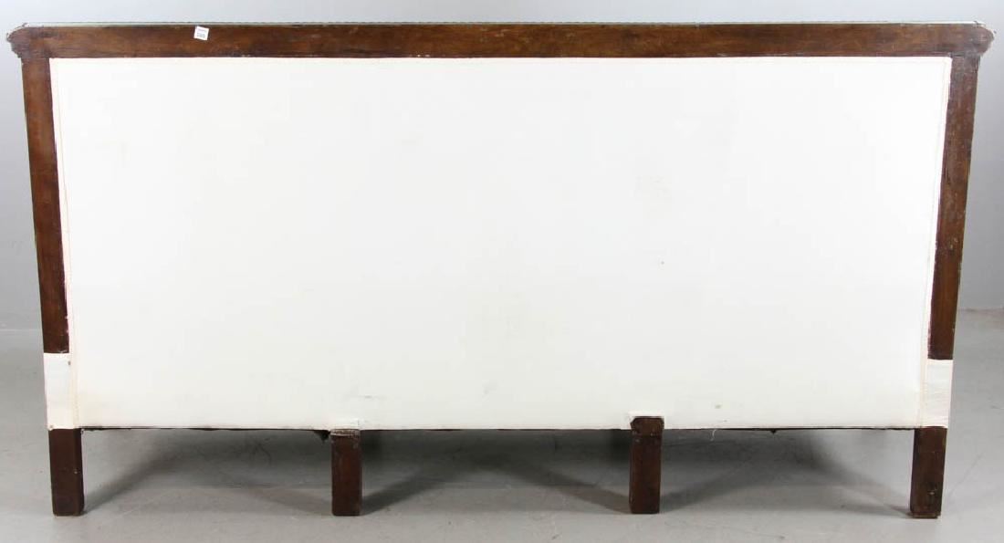 Early 19th century Italian sofa having carved maiden figures and jester and bard figures, 44" H x 85" L x 33" D. Provenance: Wakefield, Massachusetts estate.