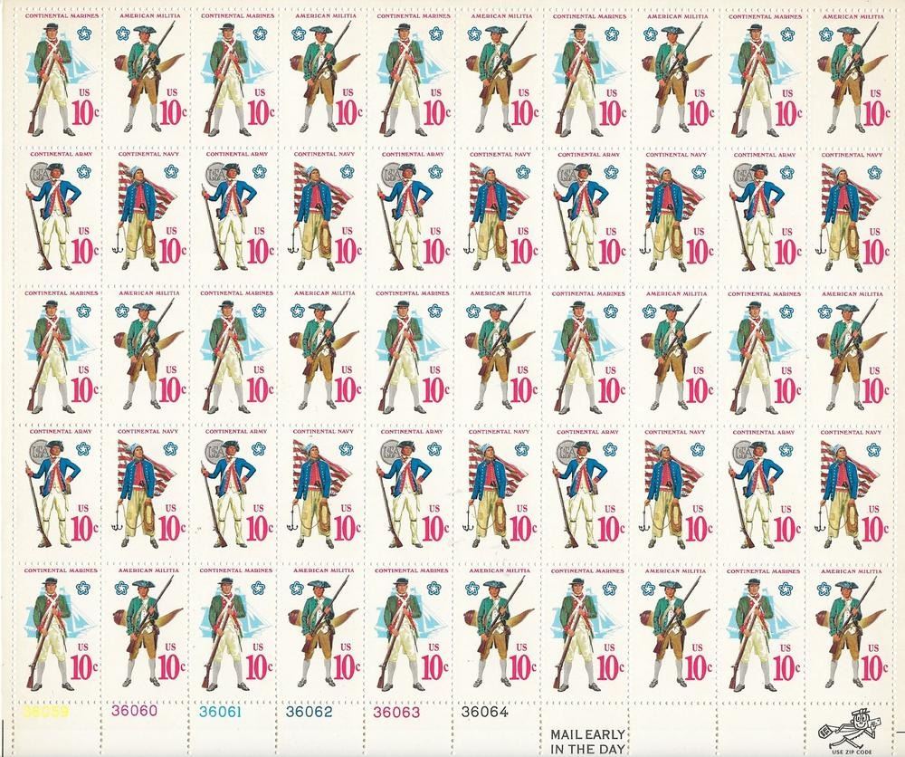 Early American Military Uniforms Stamps: Continental Marines / American Militia /Continental Army/ Continental Navy #1568a